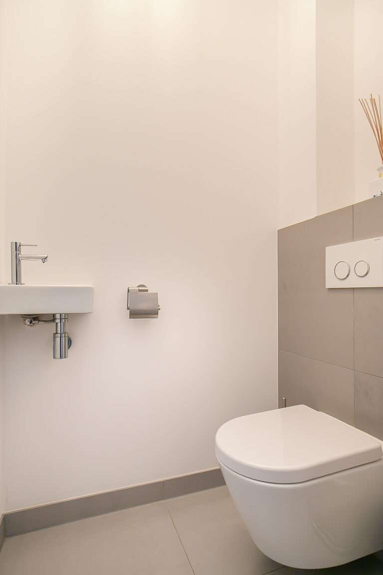 beautiful sanitary facilities, built-in taps and large gray tiles. The separate toilet is in