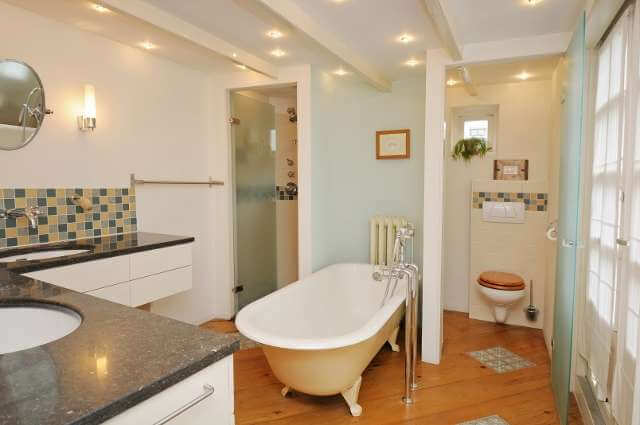 Besides the ‘walk in closet’ is the bathroom with bath, separate large rain shower, double sink and separate toilet.