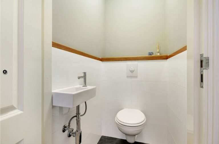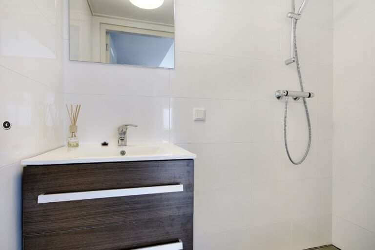 Ground floor: entrance, hall, guest toilet, living room with open kitchen with all appliances, fireplace and patio doors to the terrace. Two bedrooms, one with bathroom with bath, two rainshowers and double sinks and one spacious bedroom at the front with shower and sink.