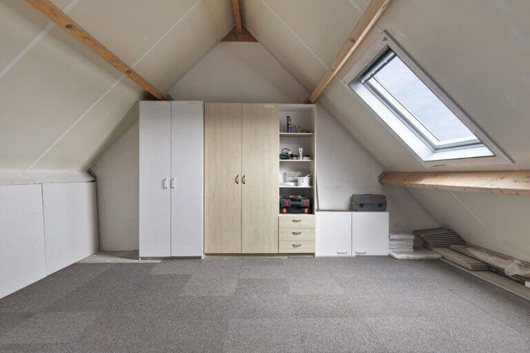 A spacious attic room with sink, extra clothing/storage cupboards, washing machine and central heating system.