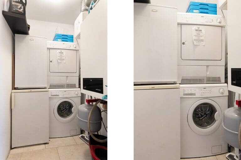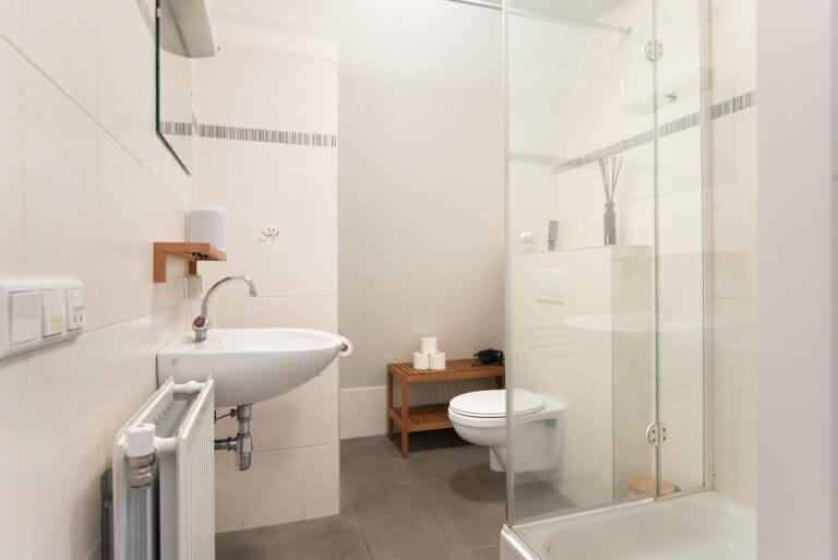 The modern bathroom has a shower, toilet and a sink. The small bedroom has a large wardrobe and a folding single bed. The storage room has the central heating and an extra fridge and freezer, as well as a washing machine and tumble dryer.