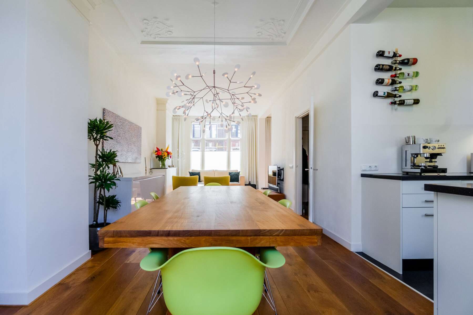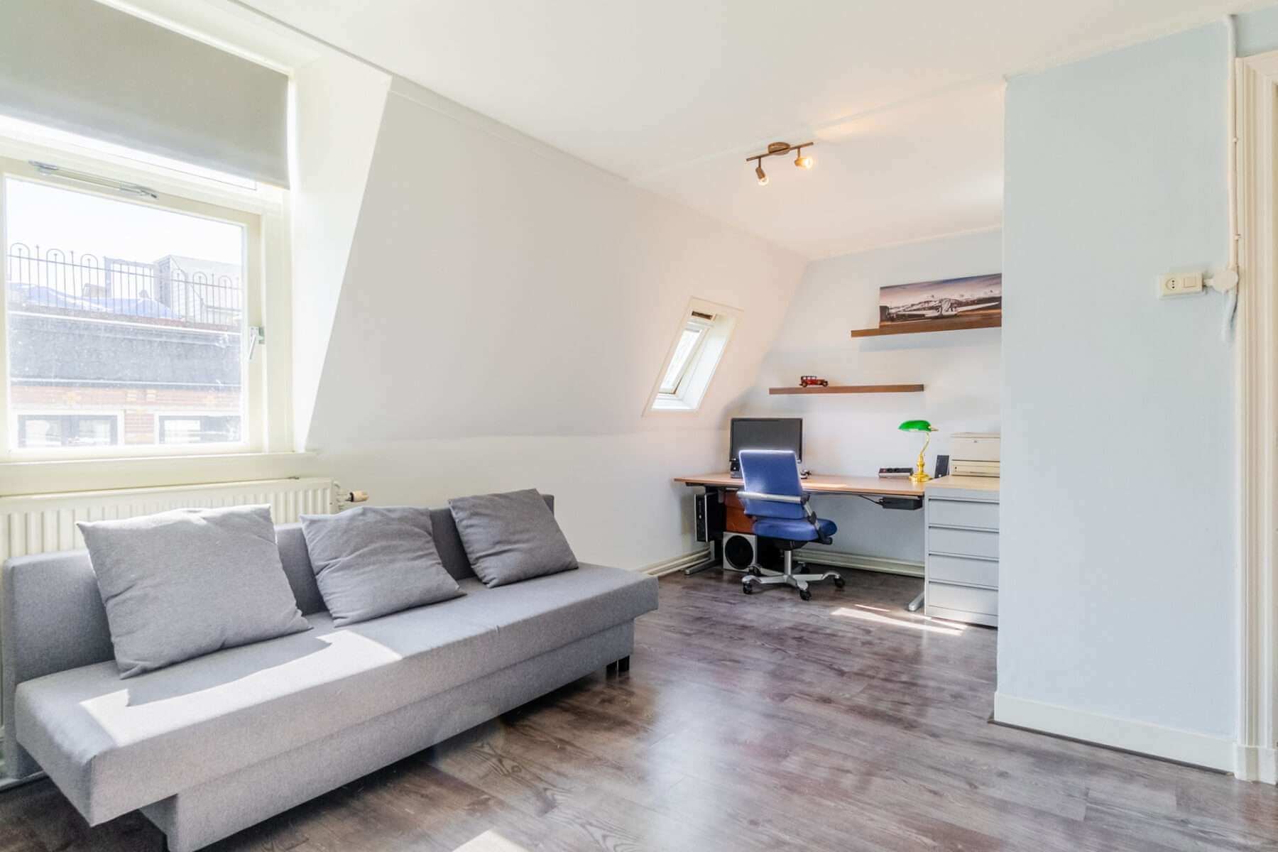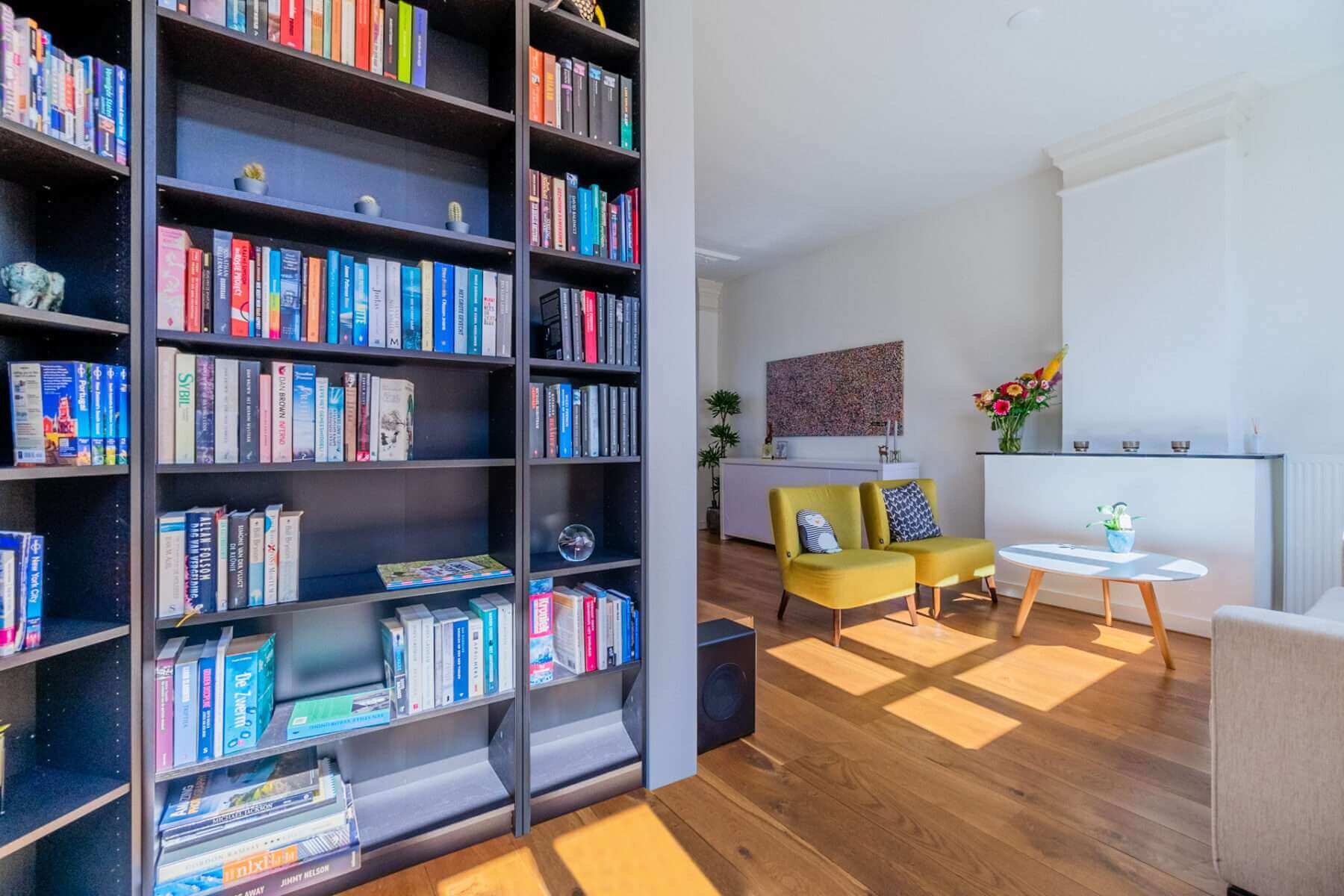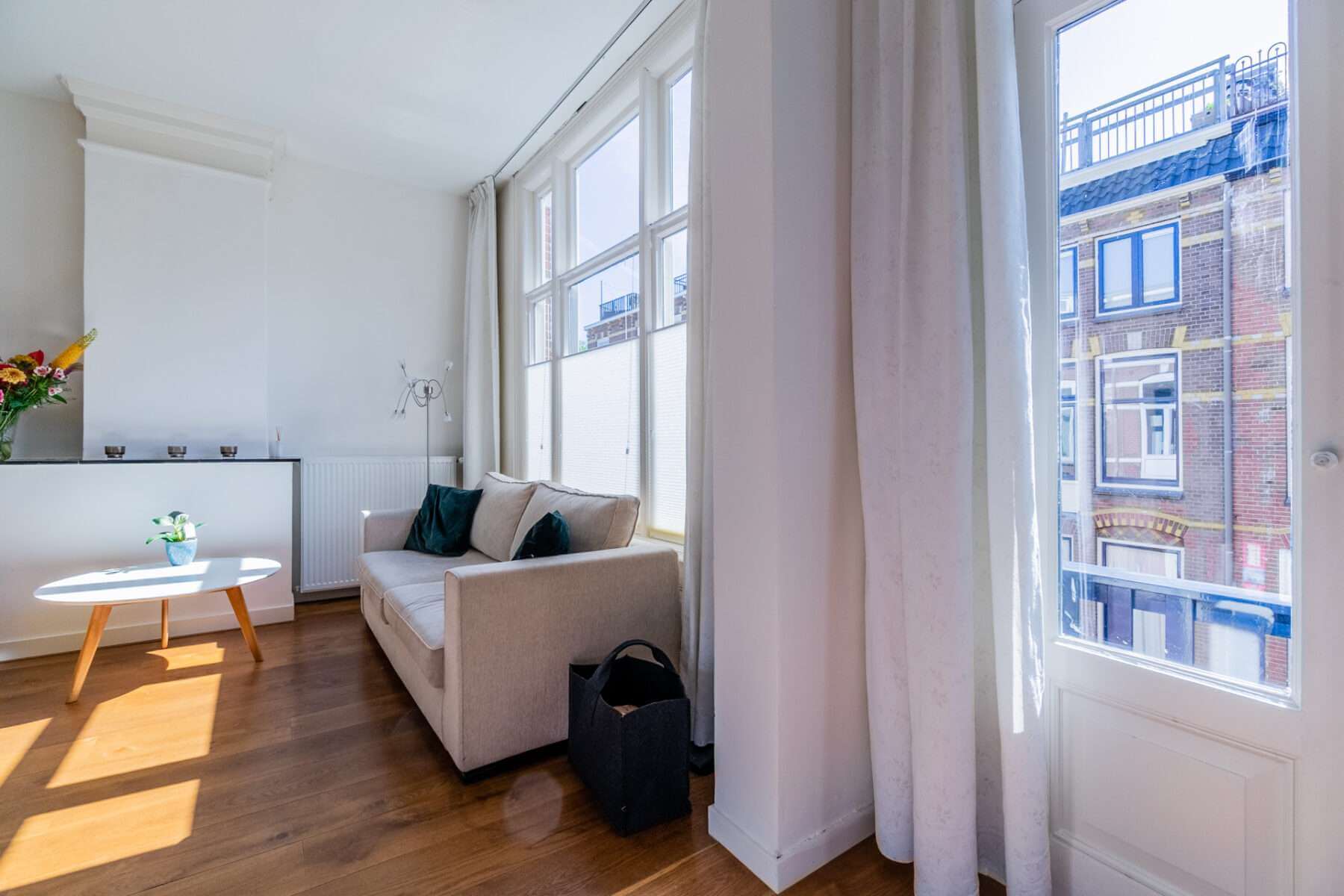 Je komt binnen op de overloop, waar een apart toilet is. De ruime woonkamer grenst aan het balkon aan de voorzijde en is heerlijk licht door de hoge plafonds en de vele ramen in de woning.