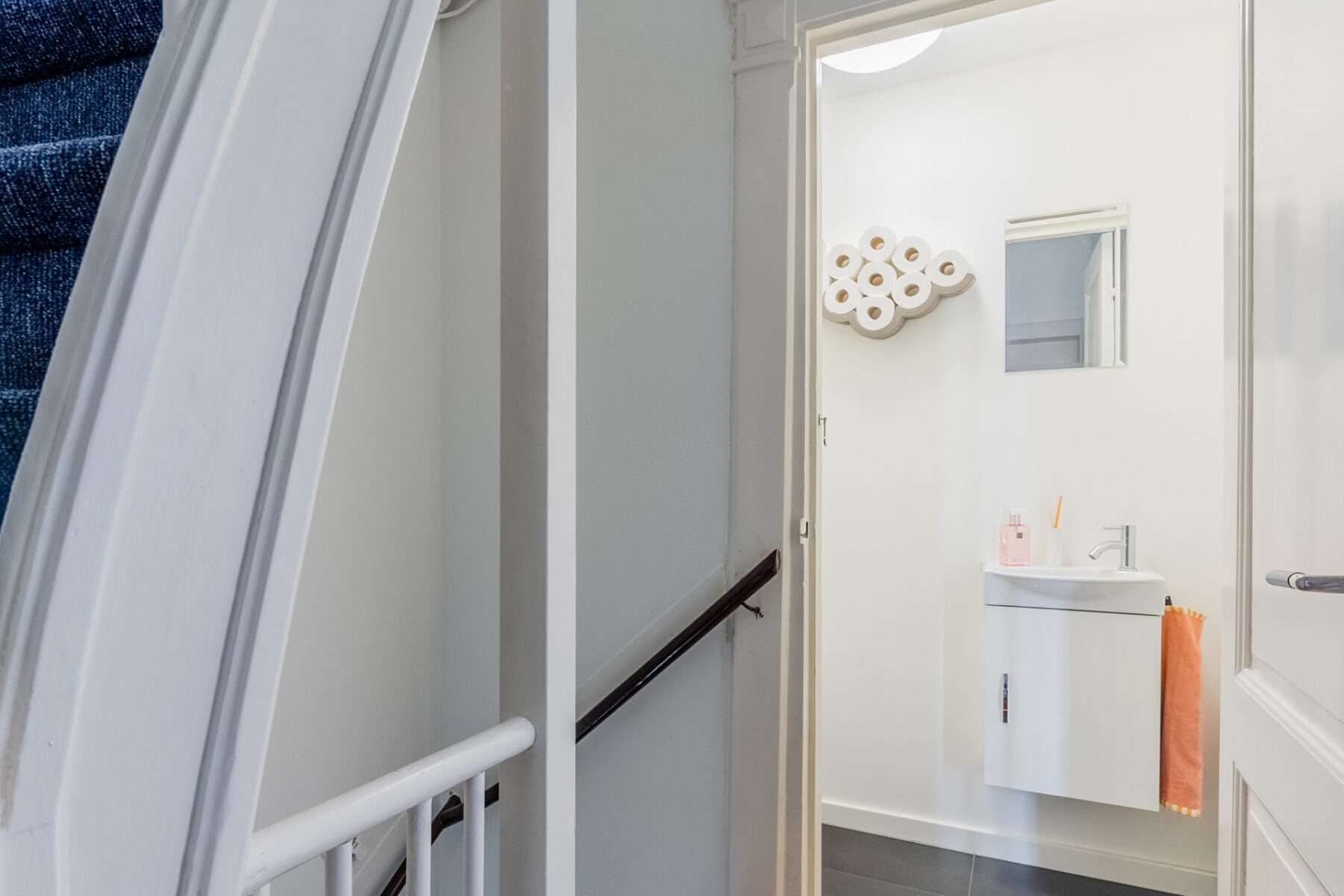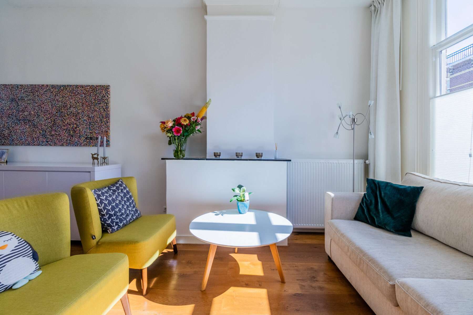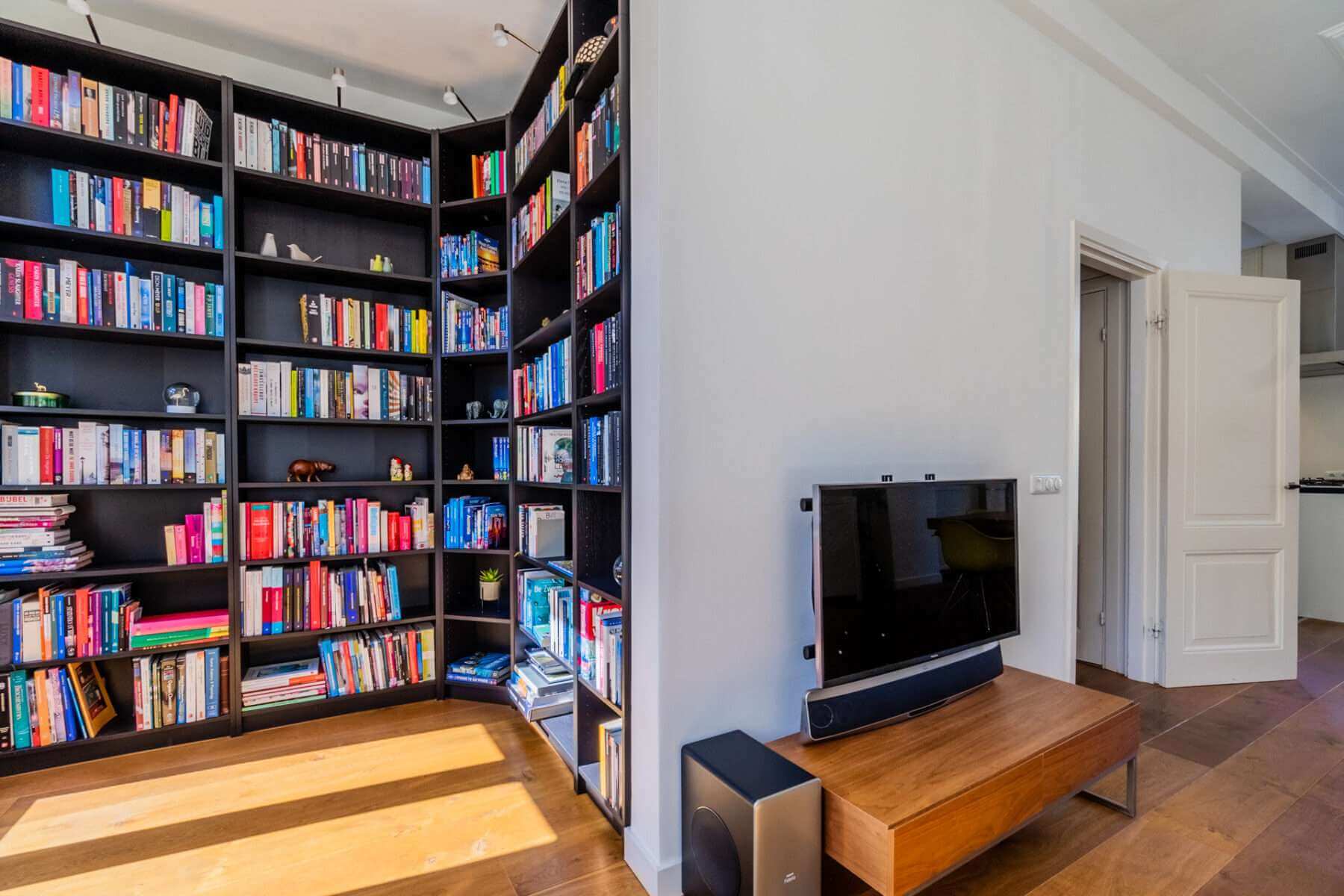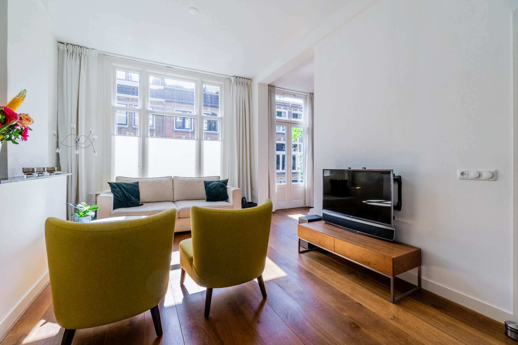 Je komt binnen op de overloop, waar een apart toilet is. De ruime woonkamer grenst aan het balkon aan de voorzijde en is heerlijk licht door de hoge plafonds en de vele ramen in de woning.