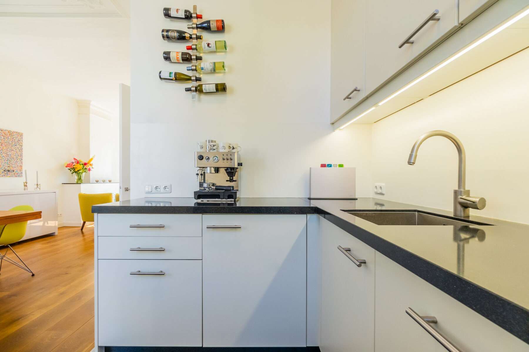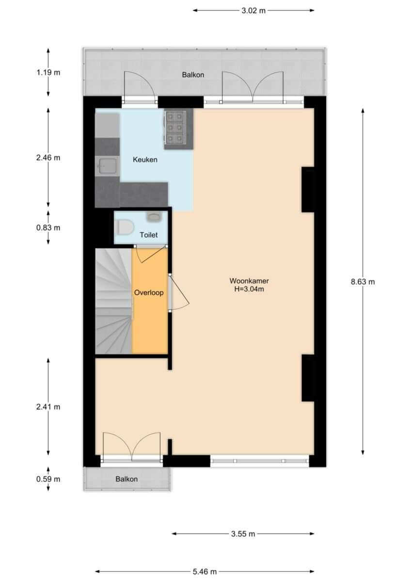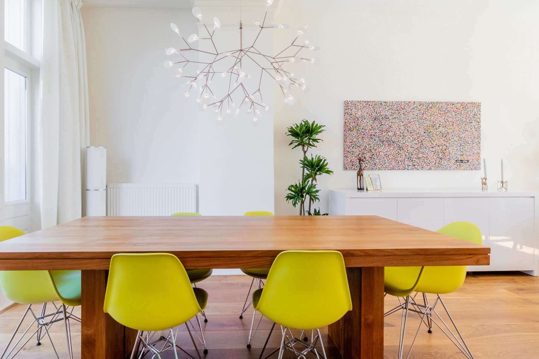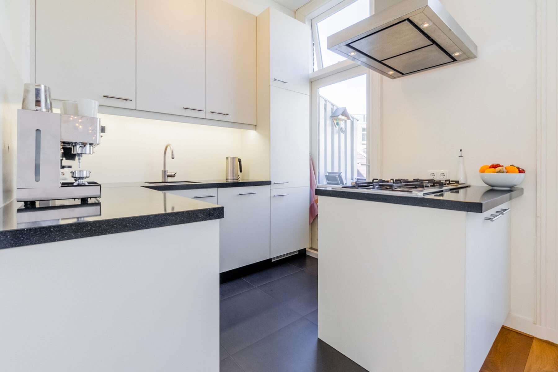 Je komt binnen op de overloop, waar een apart toilet is. De ruime woonkamer grenst aan het balkon aan de voorzijde en is heerlijk licht door de hoge plafonds en de vele ramen in de woning.