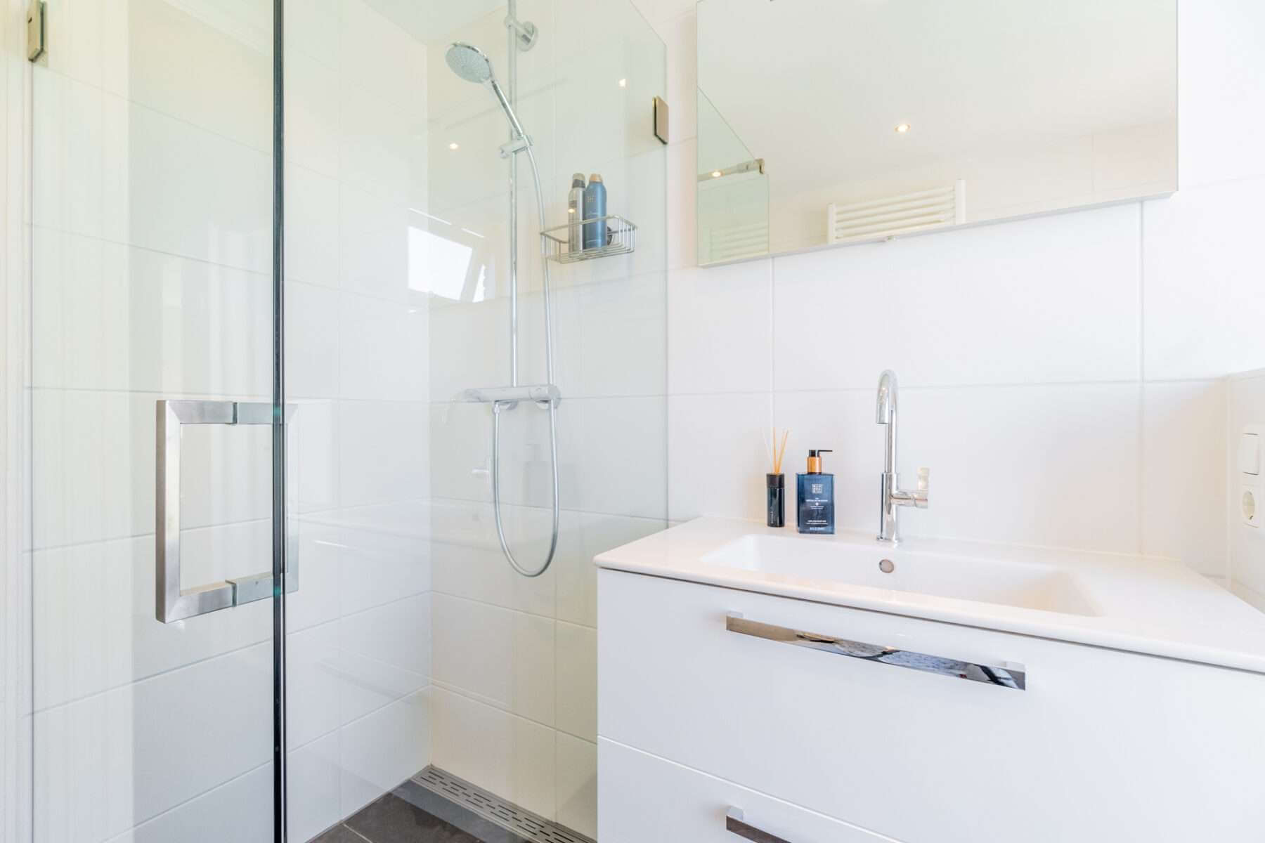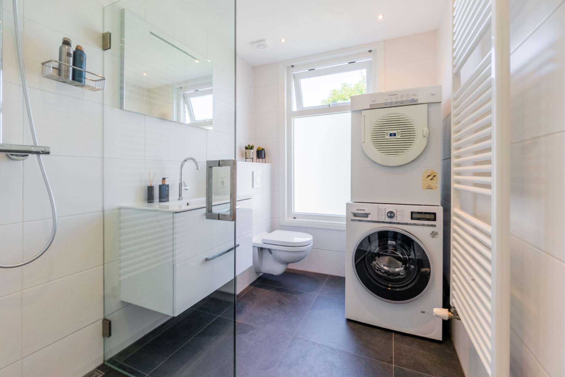 De badkamer is strak afgewerkt met een tweede toilet, douche, wastafelmeubel en aansluitingen voor de wasmachine en droger.