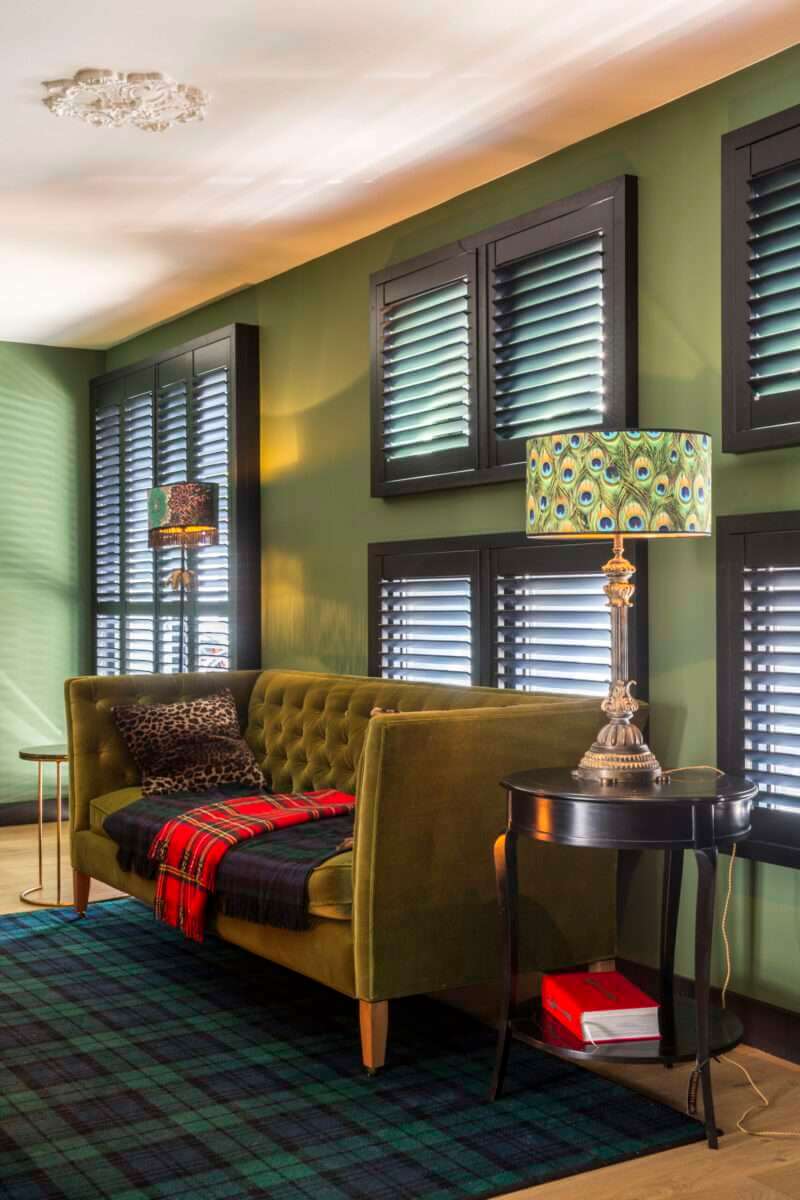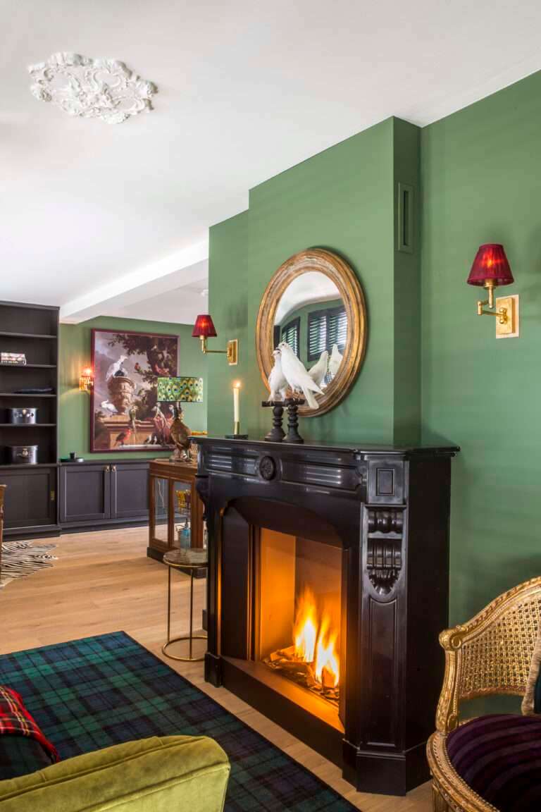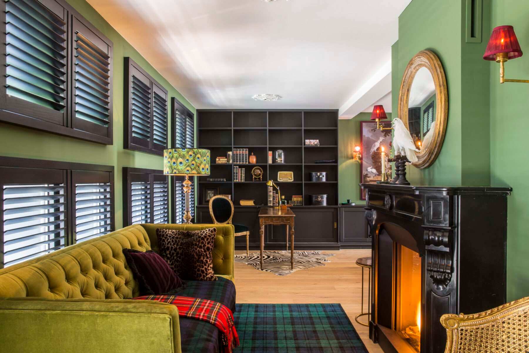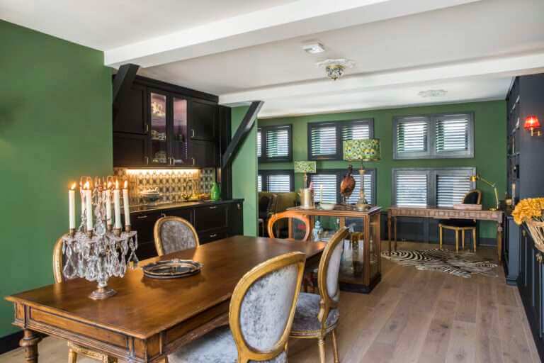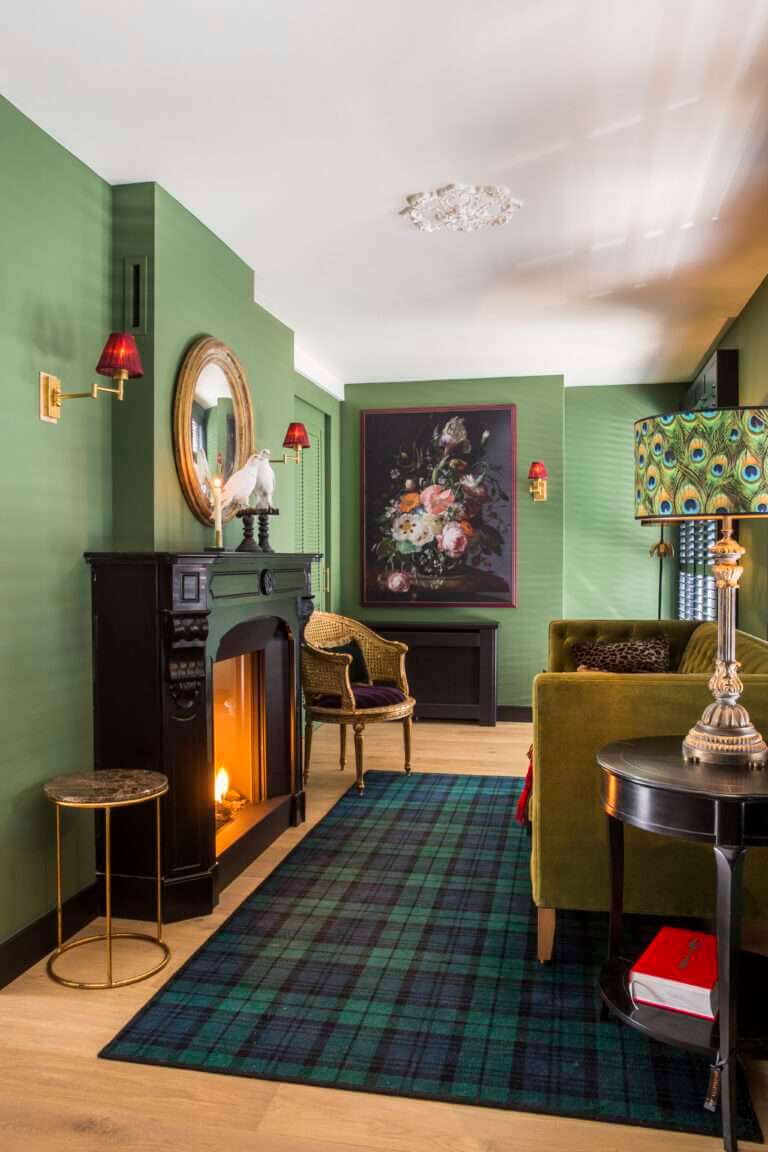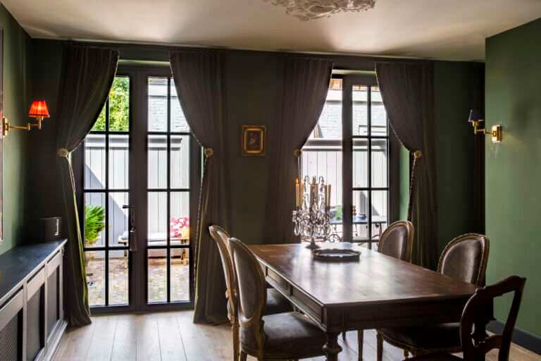Centrale entree met postbussen en toegangsdeur naar appartement. Comfortabele bank bij een open haard, schrijftafel en bibliotheek, fraai geëquipeerde keuken met inductiekookplaat, koelkast, afzuigkap en vaatwasser. Badkamer met inloopdouche en authentieke wastafel. Sfeervolle slaapkamer met kingsize bed.