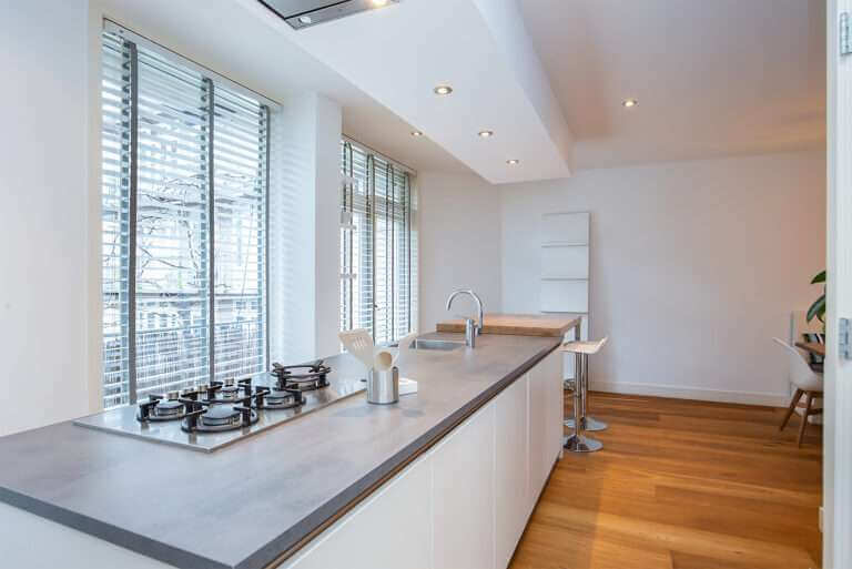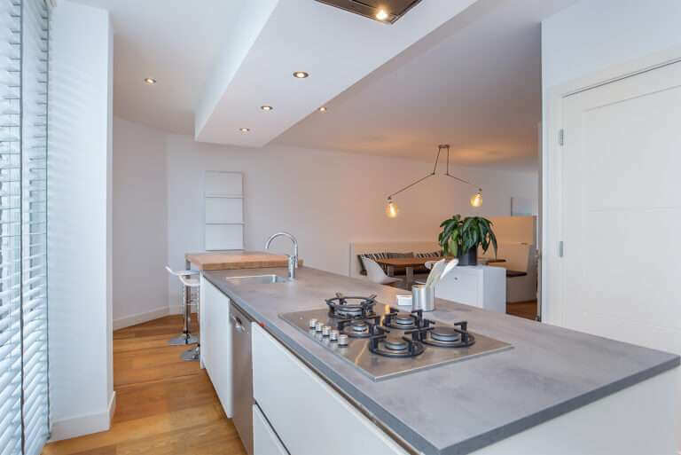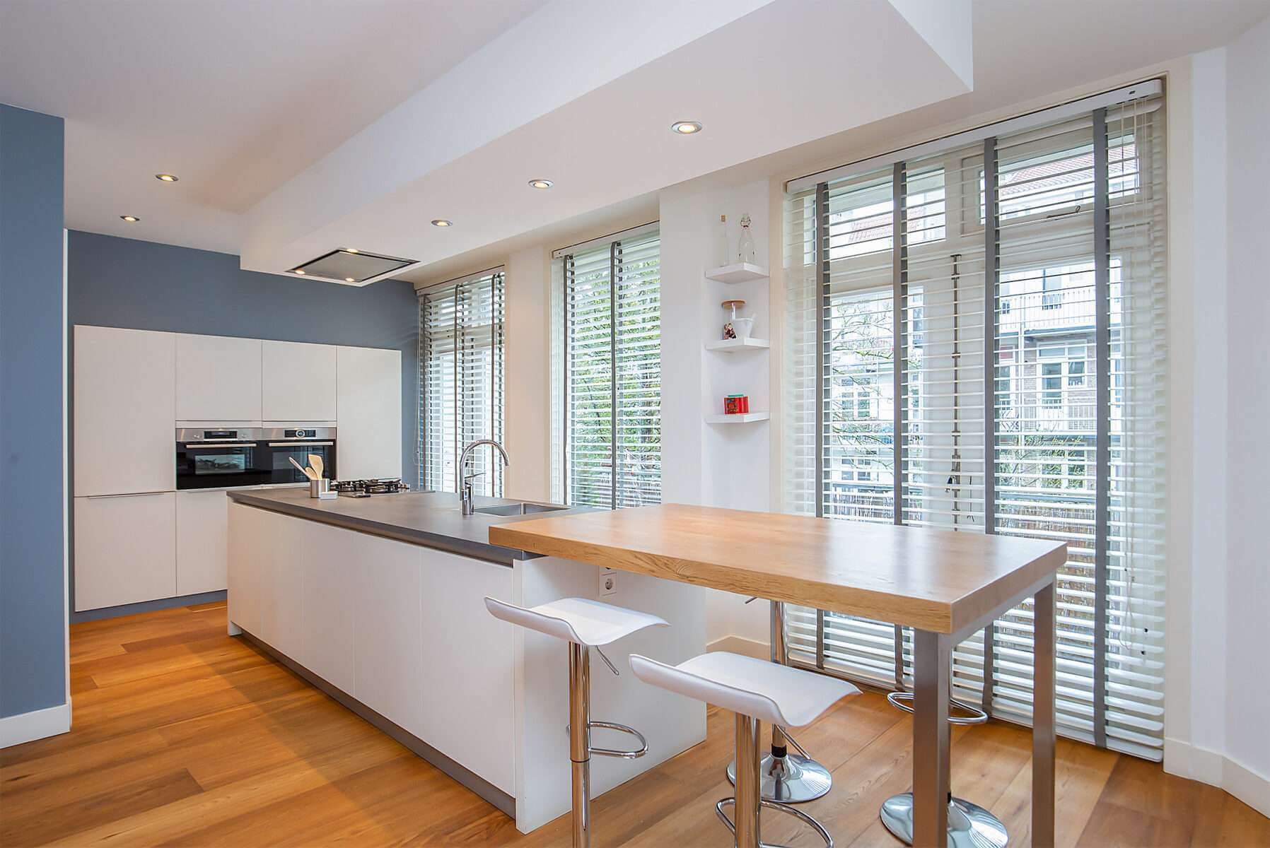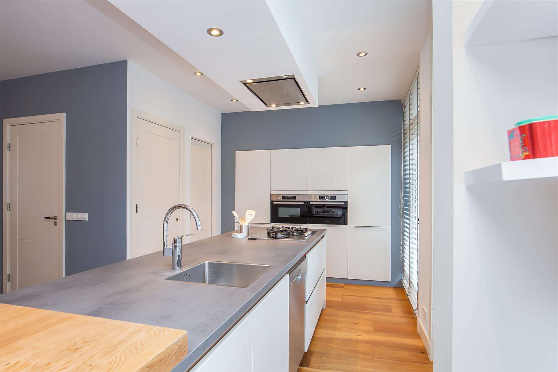 De keuken kenmerkt zich door een groot kook- en spoeleiland. Heerlijk koken terwijl je gezin of gasten zowat naast je zitten aan de bar en eettafel als verlengstuk van het kookeiland. Hoe gezellig is dat!