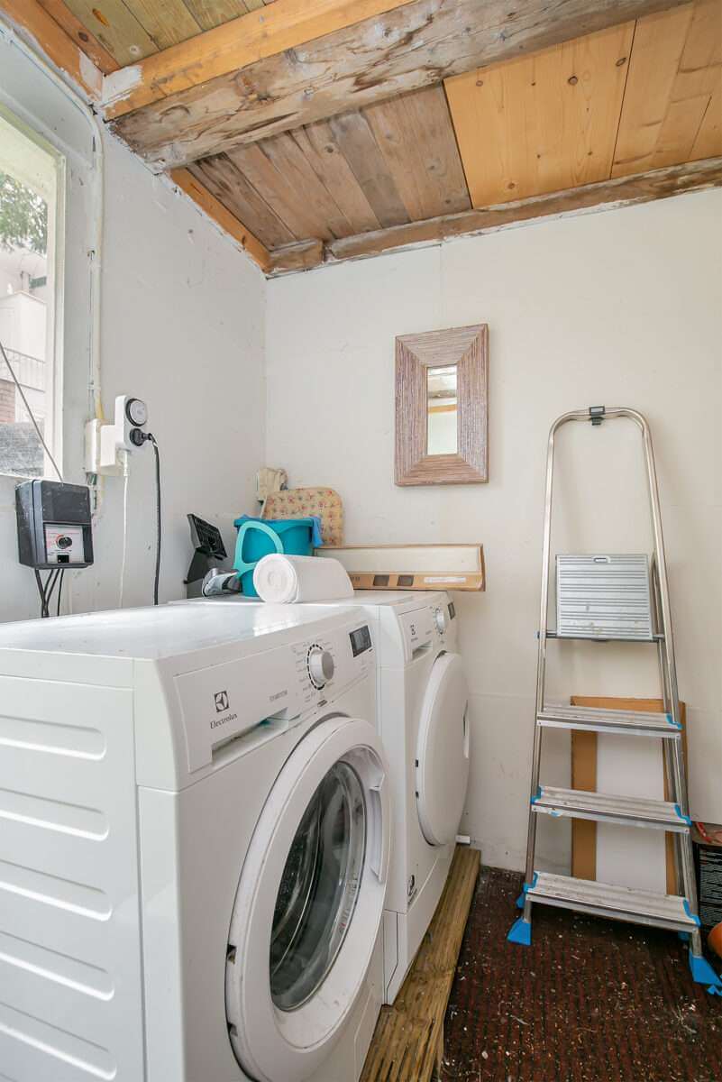 De wasmachine en droger staan in de berging in de tuin opgesteld.