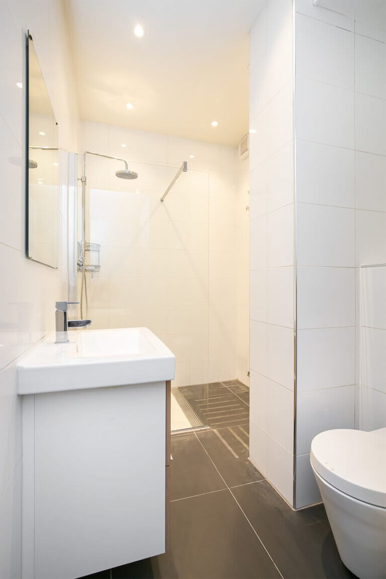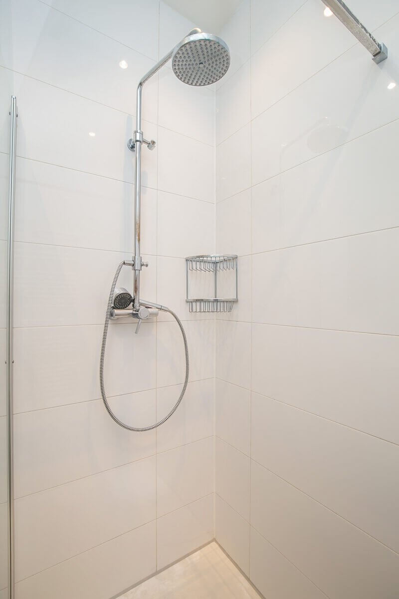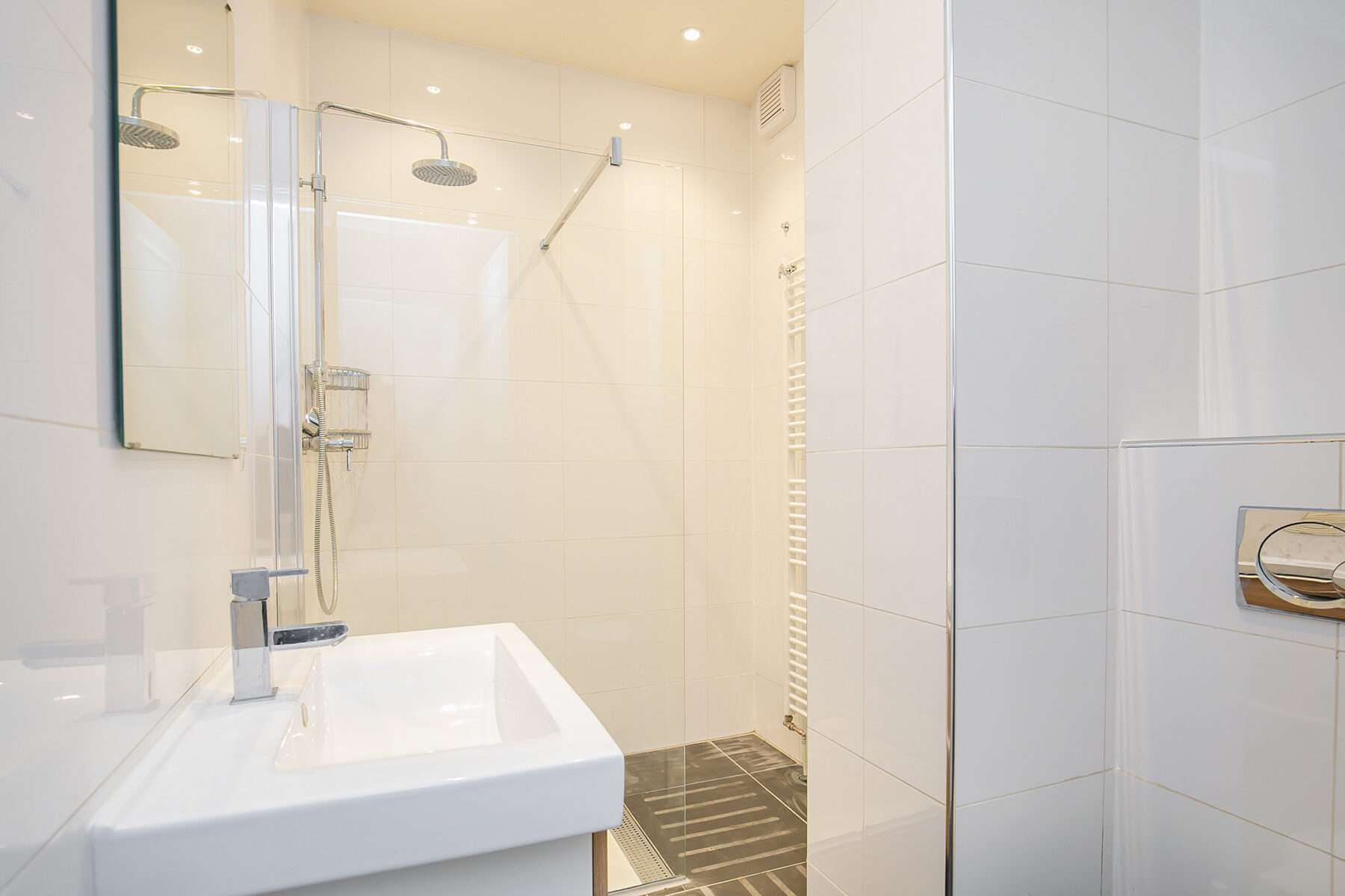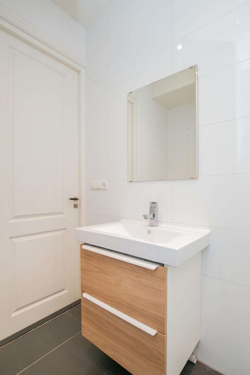 De luxe badkamer is voorzien van dubbele wastafel, inloopdouche en toilet.