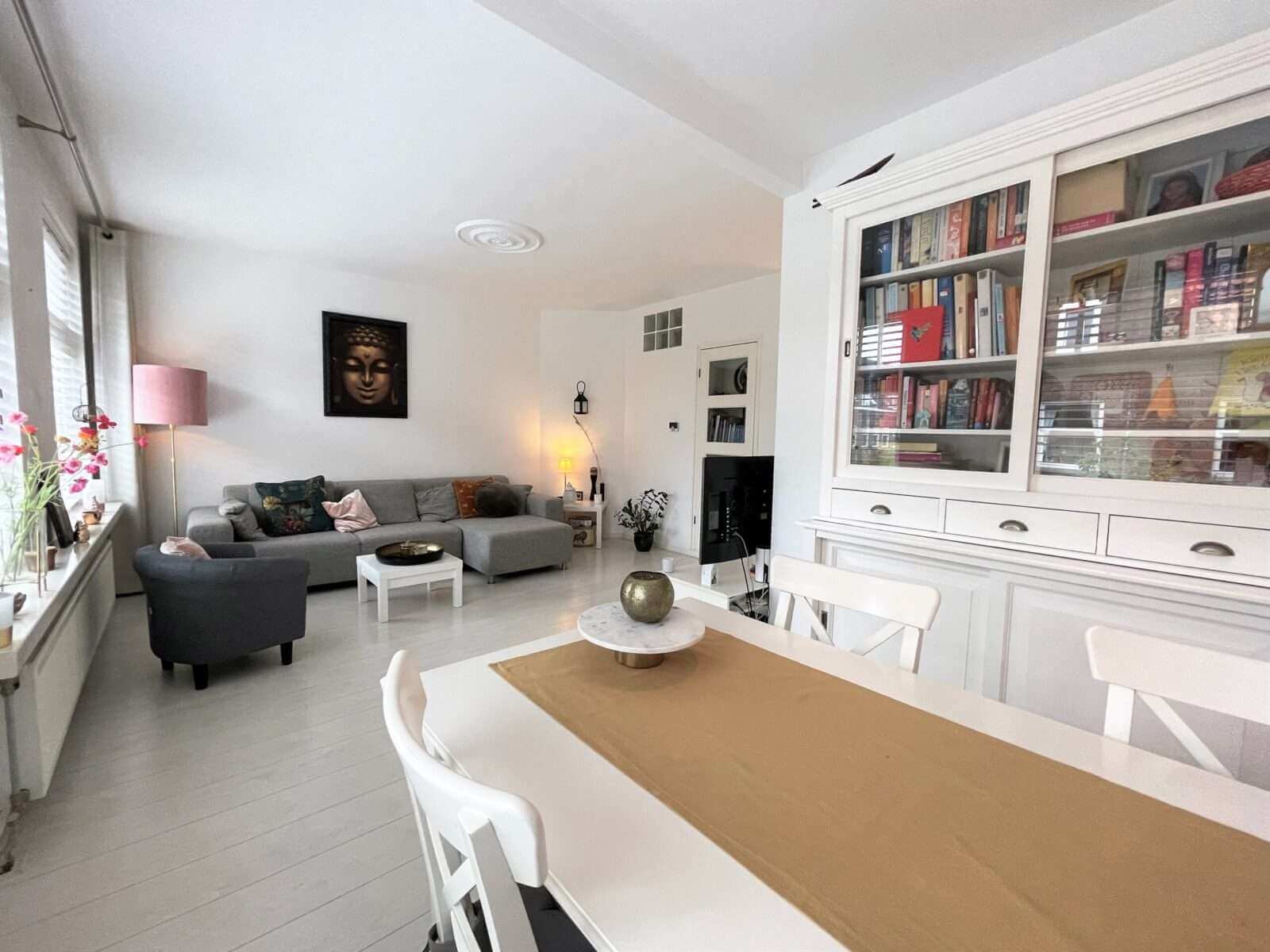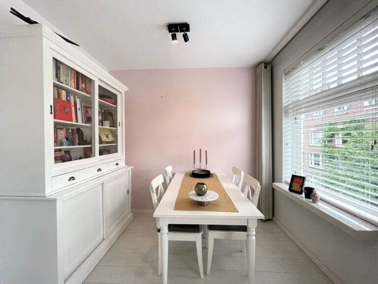 Op de eerste verdieping bevindt zich de ruime en lichte woonkamer aan de voorzijde van de woning met eettafel in de serre.