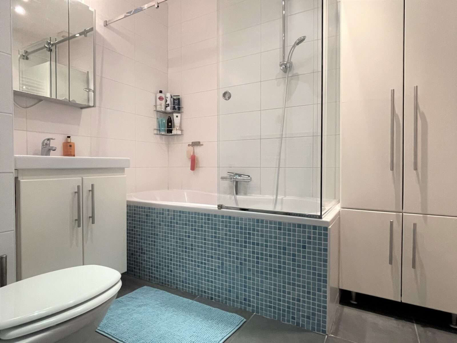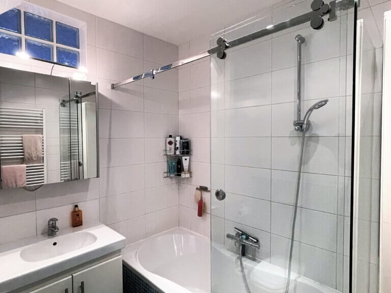 De eerste badkamer is voorzien van ligbad, wastafel, toilet en vloerverwarming.