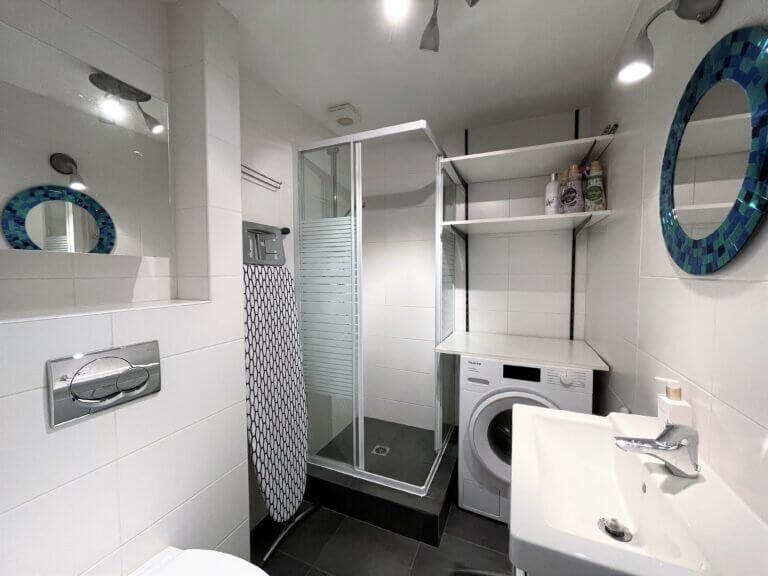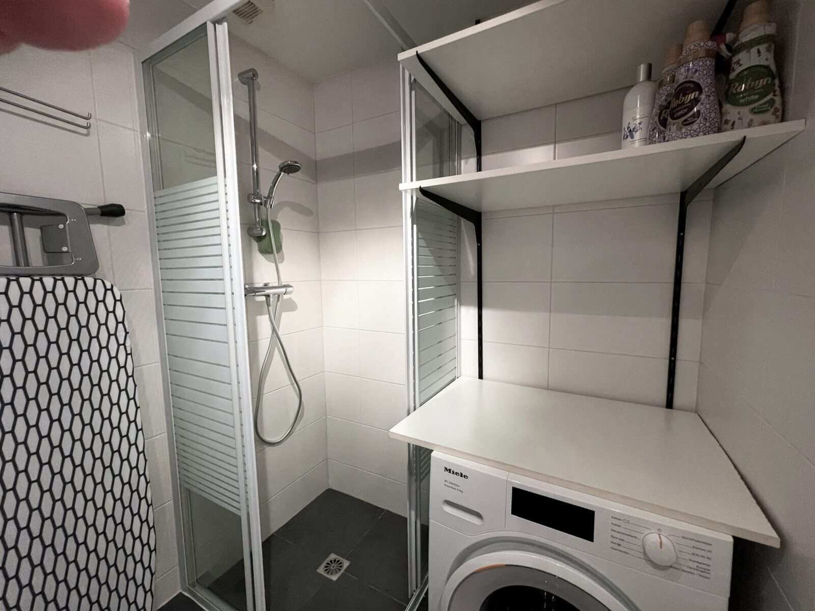 De tweede badkamer van moderne douche, wastafel, toilet en wasmachine.