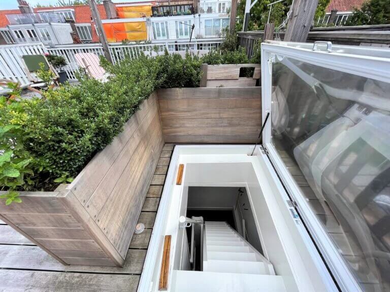 Op de bovenste derde verdieping komt u uit op het ruime dakterras met prachtig uitzicht over de wijk.