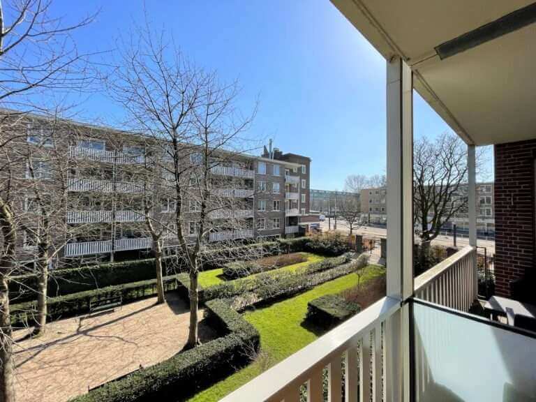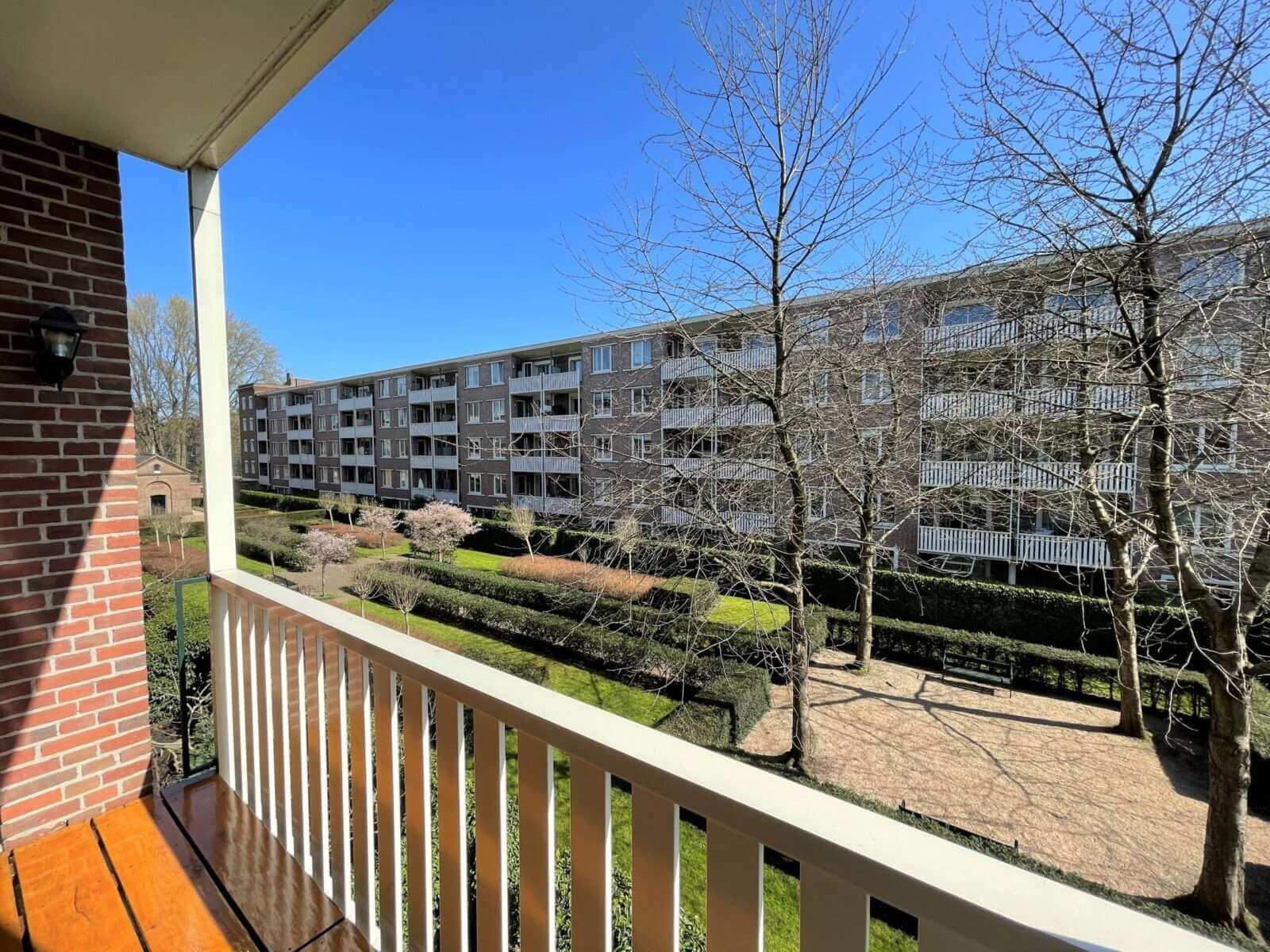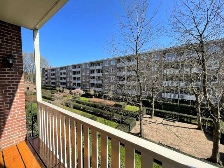 Vanaf het balkon heb je leuk zicht op de fraai aangelegde en goed onderhouden gemeenschappelijke tuin met kapel en op de Kolenkitkerk.
