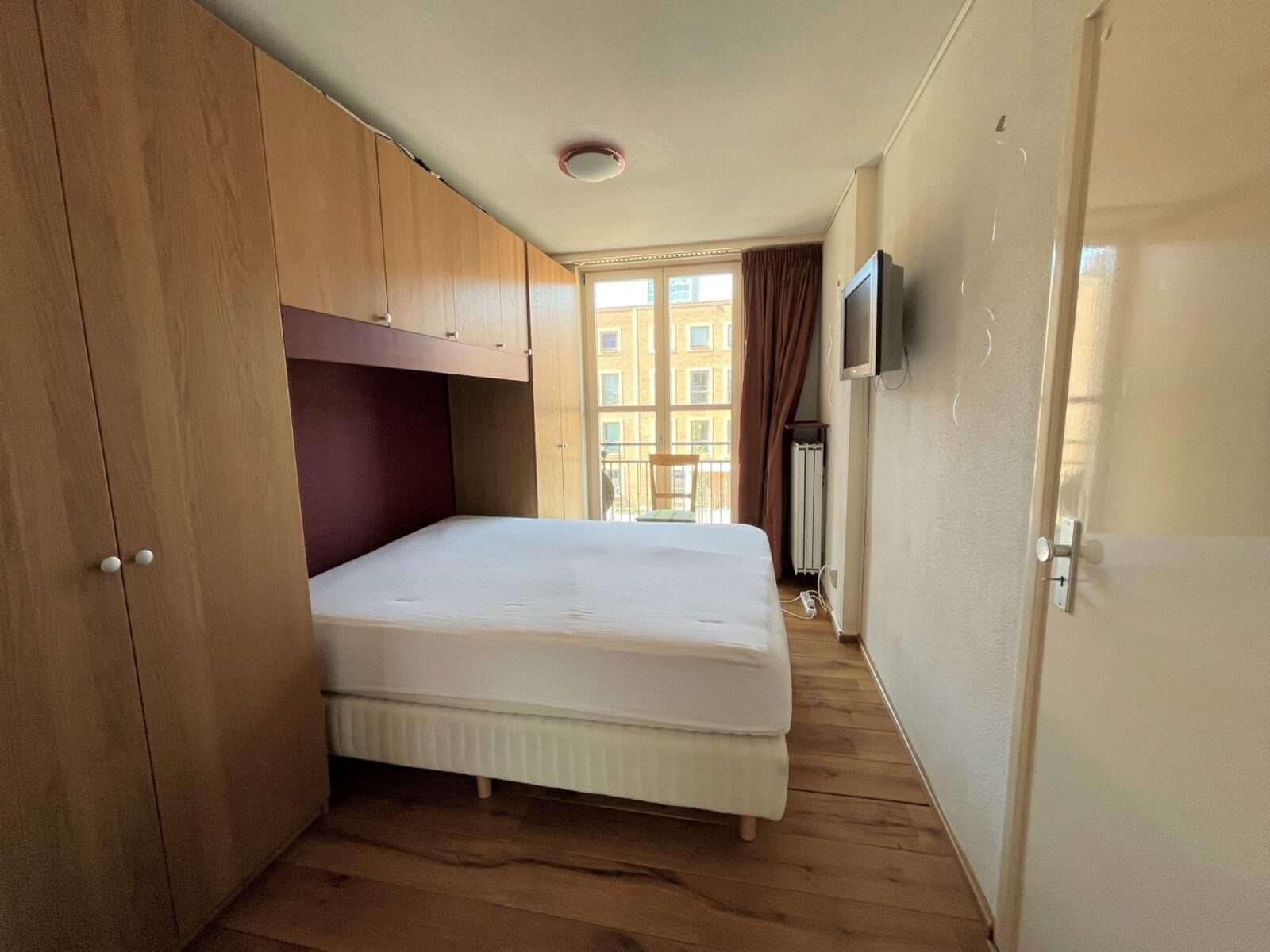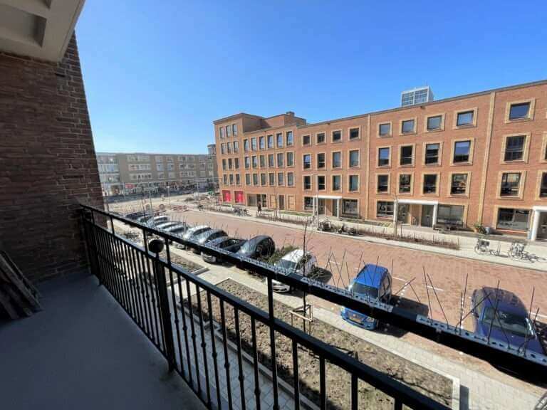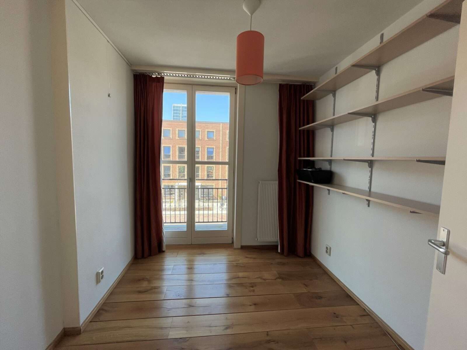 Aan de voorzijde liggen de twee slaapkamers met openslaande deuren (kiep/kantelstand) naar het balkon aan de voorzijde (westen).