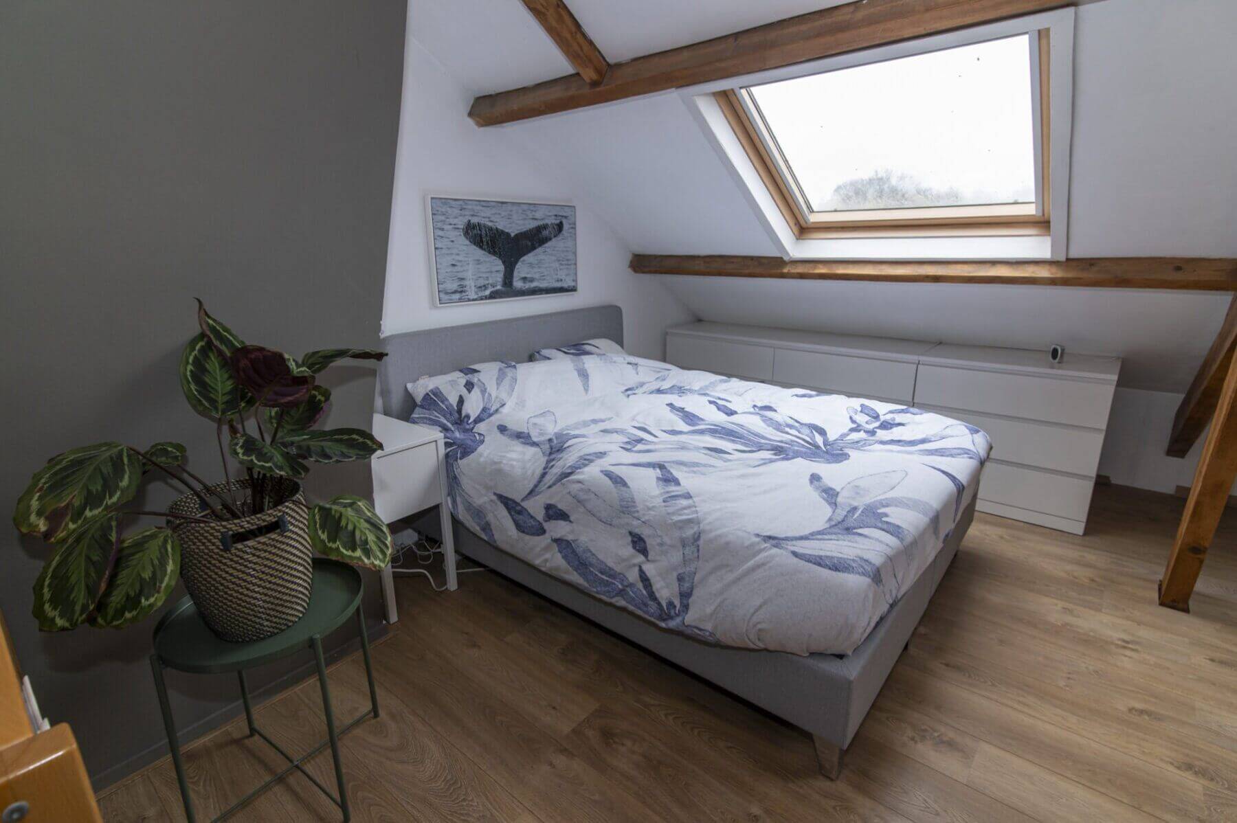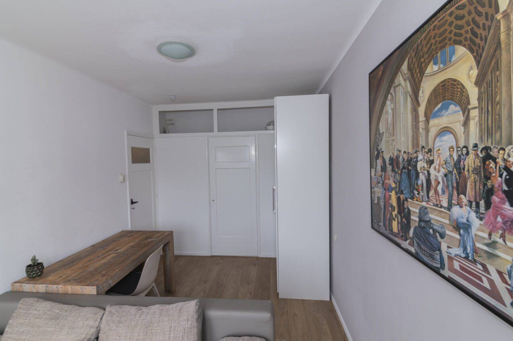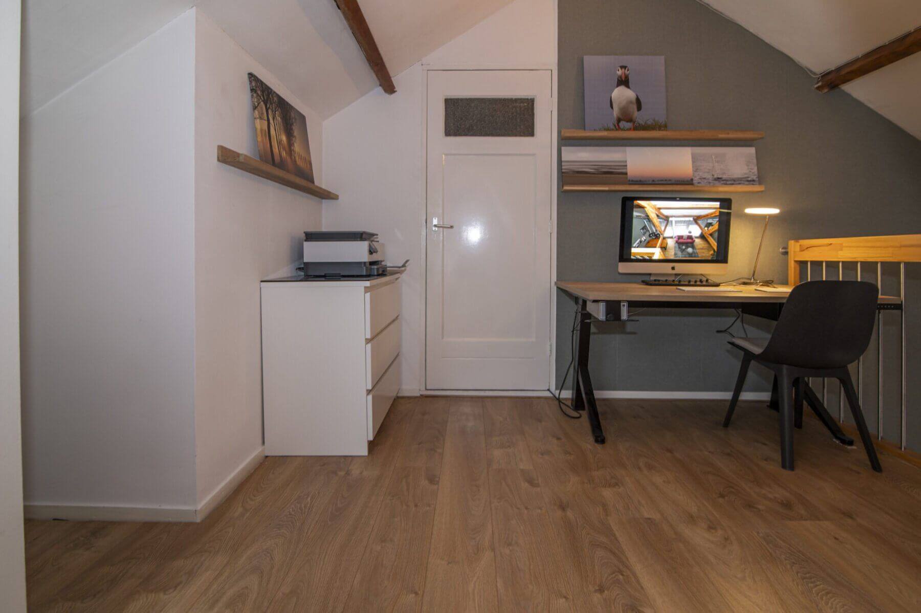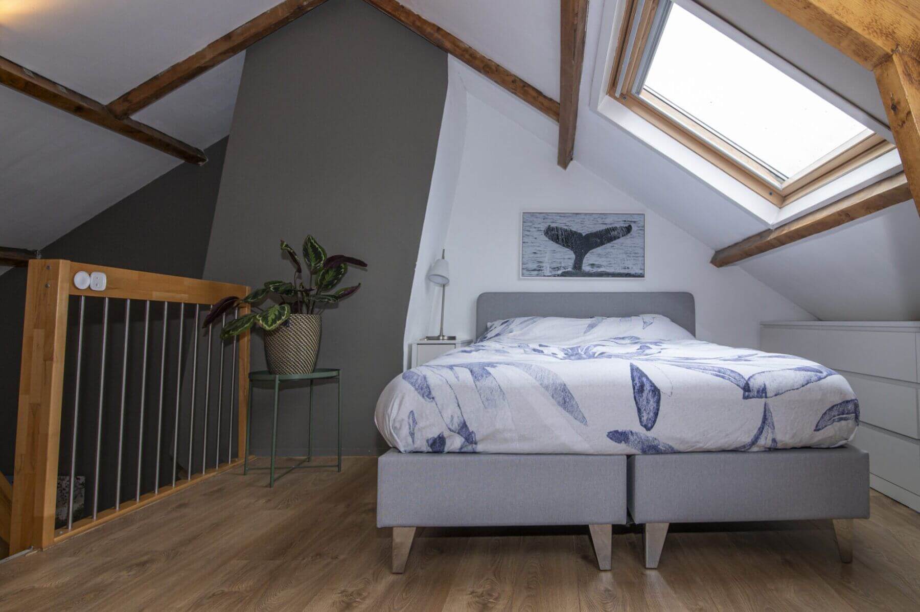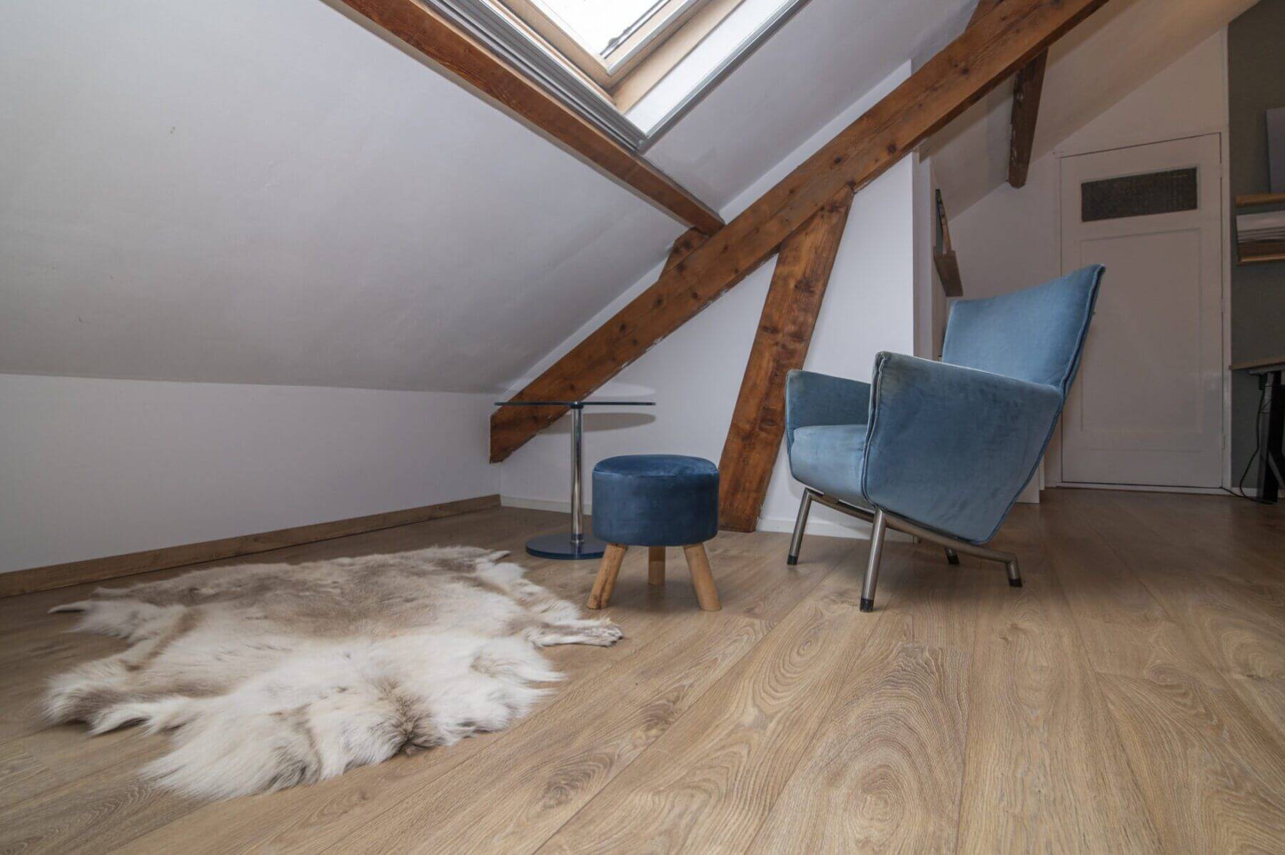 We beginnen met de werkelijke “eyecatcher” van deze woning. De woonkamer met vide is het hart van dit appartement. Het is modern en toch uiterst sfeervol met een levendig uitzicht op de Amsterdamseweg. Hier heeft u overigens zeer weinig last van het verkeer door de geluidswerende dubbele ramen. De vide is te gebruiken voor vele doeleinden. De prachtige spanten die we hier zien verbinden boven met beneden waardoor er een prachtige eenheid ontstaat. Door de dakramen, die zijn voorzien van verduistering, is deze vide ook geschikt als slaapruimte en te combineren met werkplek. “Boven” vinden we ook een bergkast met de cv opstelling (Vaillant, bouwjaar 2014), wasmachine aansluiting en uiteraard is het dak goed geïsoleerd. De afwerking is hoogwaardig met o.a. een strak gelegde laminaatvoer, hoge plinten en gestucte wanden.