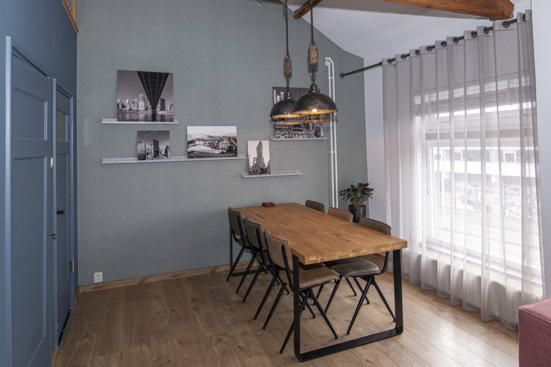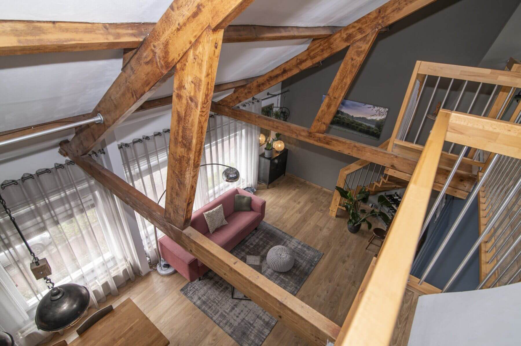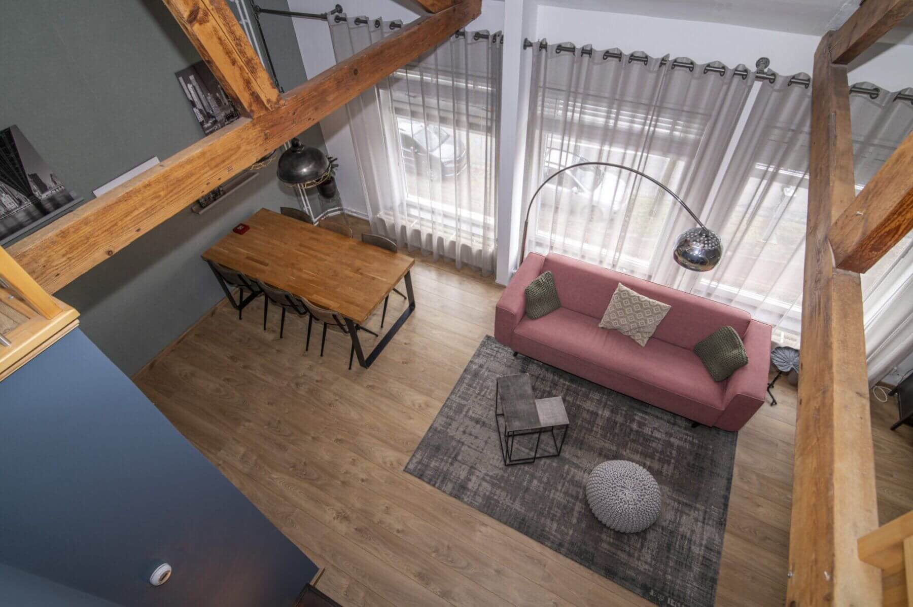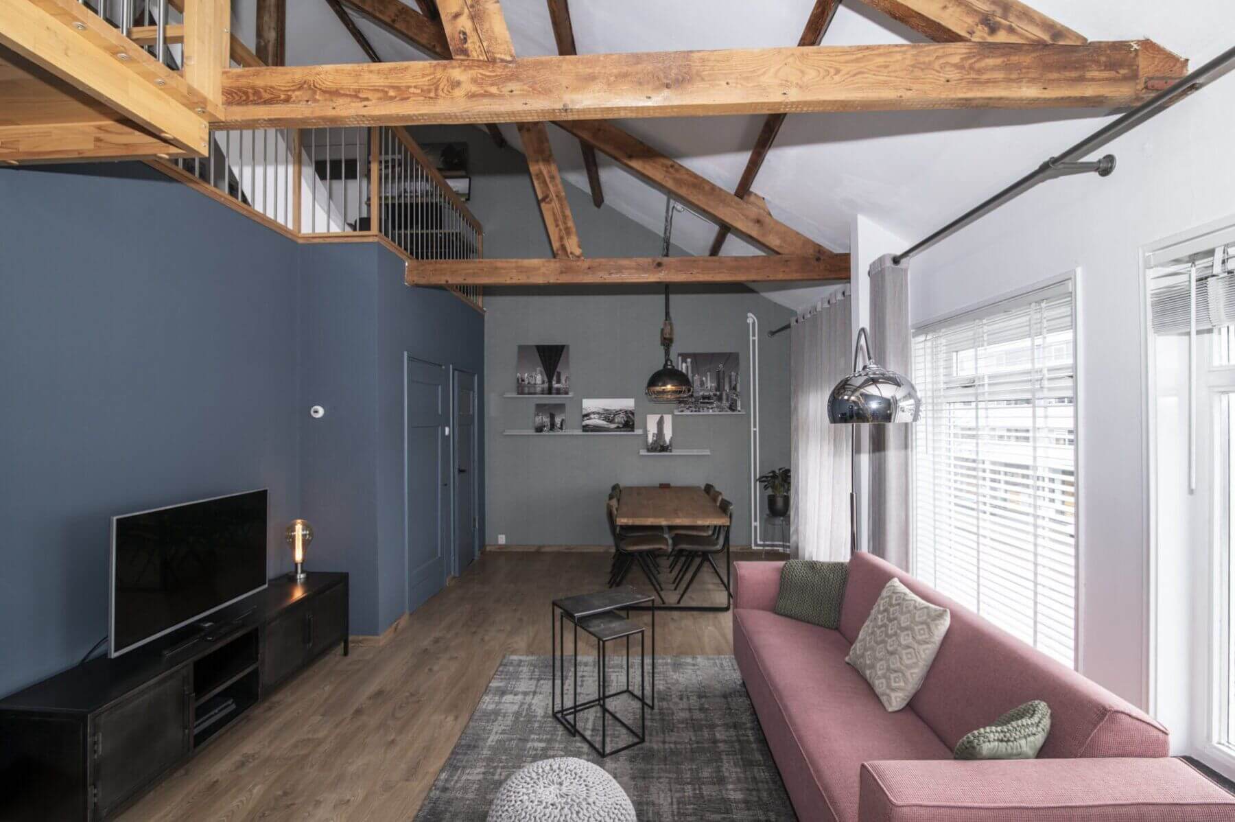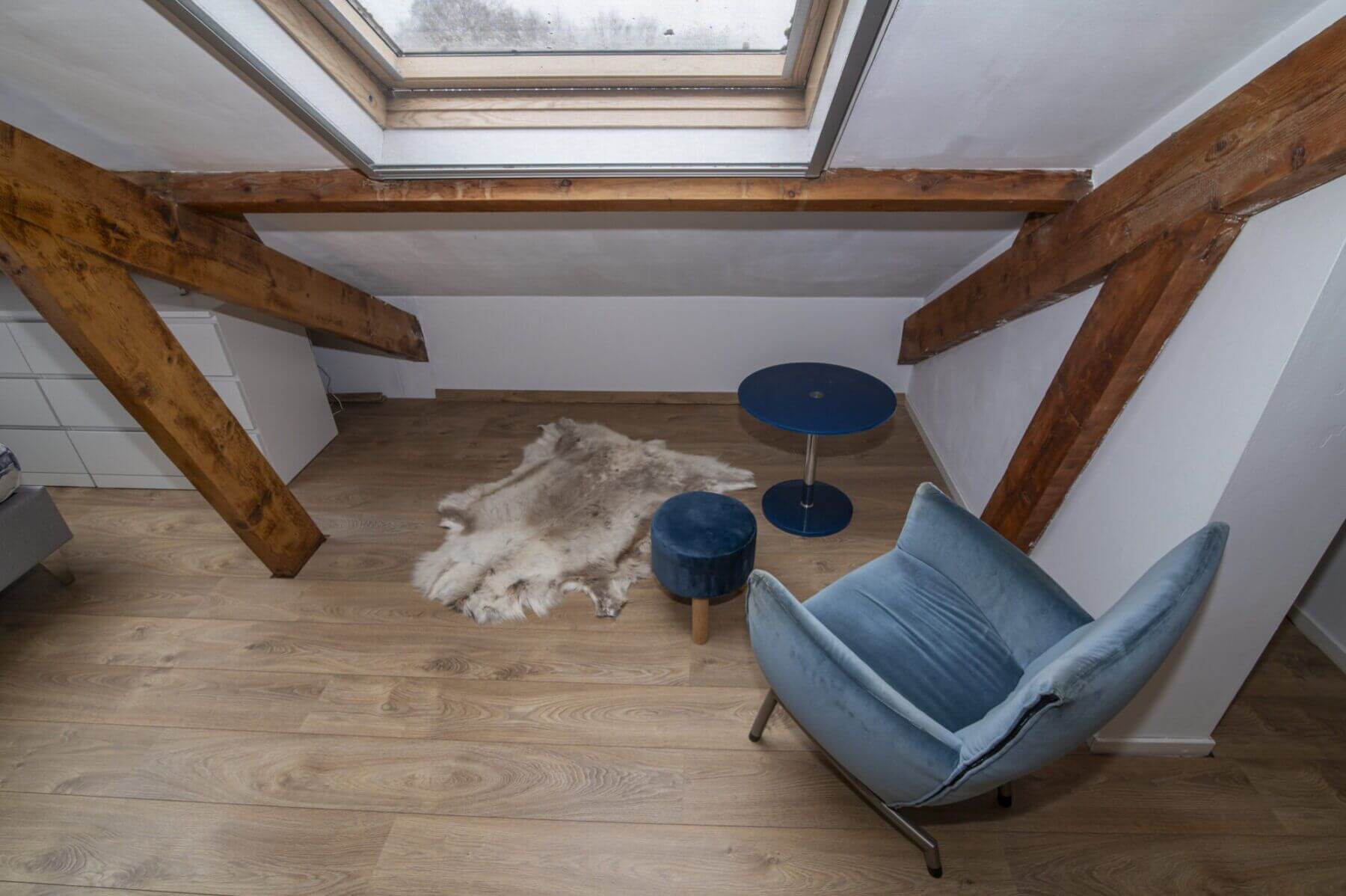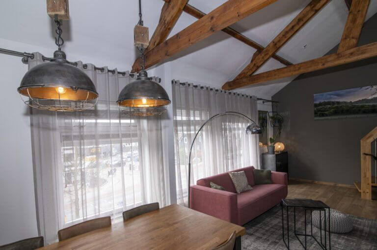 We beginnen met de werkelijke “eyecatcher” van deze woning. De woonkamer met vide is het hart van dit appartement. Het is modern en toch uiterst sfeervol met een levendig uitzicht op de Amsterdamseweg. Hier heeft u overigens zeer weinig last van het verkeer door de geluidswerende dubbele ramen. De vide is te gebruiken voor vele doeleinden. De prachtige spanten die we hier zien verbinden boven met beneden waardoor er een prachtige eenheid ontstaat. Door de dakramen, die zijn voorzien van verduistering, is deze vide ook geschikt als slaapruimte en te combineren met werkplek. “Boven” vinden we ook een bergkast met de cv opstelling (Vaillant, bouwjaar 2014), wasmachine aansluiting en uiteraard is het dak goed geïsoleerd. De afwerking is hoogwaardig met o.a. een strak gelegde laminaatvoer, hoge plinten en gestucte wanden.