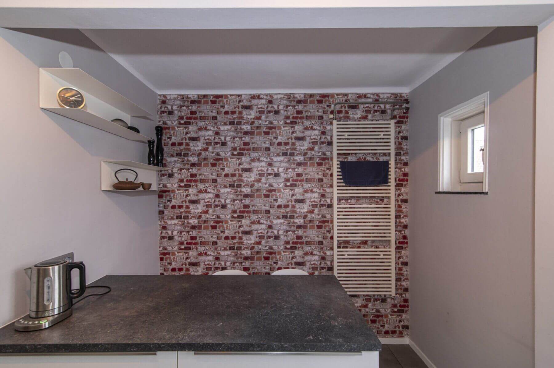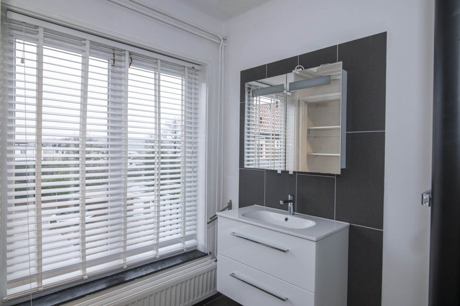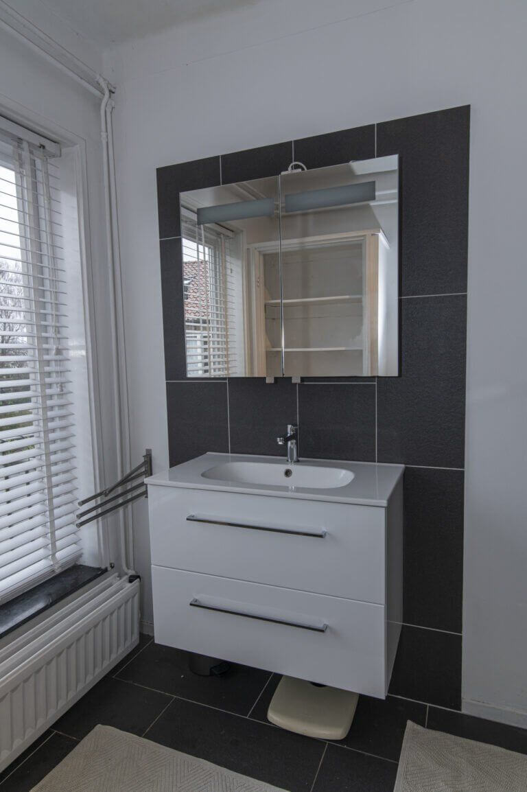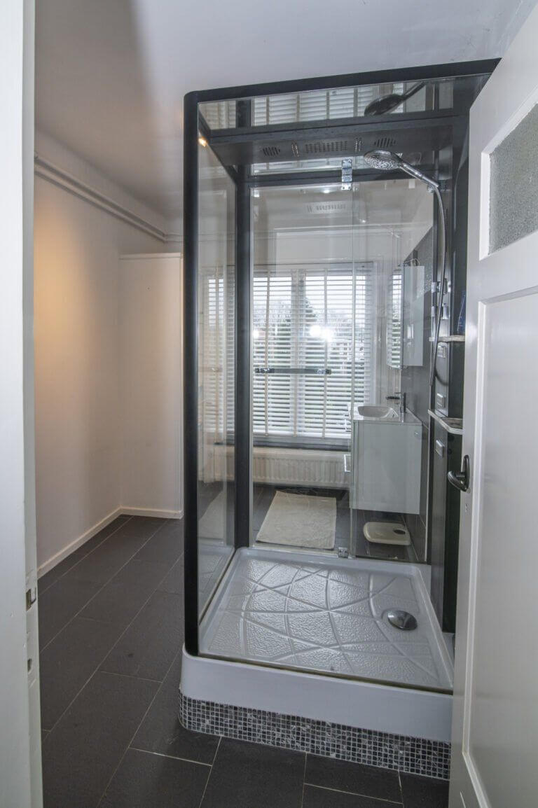 We volgen de hoogwaardige afwerking van het appartement, langs het separate, gemoderniseerde toilet, tot aan de volgende ruimte, de badkamer. Deze is in 2015 gerealiseerd en gemoderniseerd. Hoge ramen over de gehele breedte brengen voldoende licht in deze ruimte. Aanwezig is hier een wastafelmeubel met spiegelkast en de ruime douchecabine met massagedouche, rainshower en handdouche.