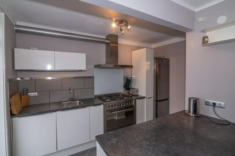De hoogglans en strak afgewerkte keuken is voorzien van een 5 pits gasfornuis met ingebouwde elektrische oven, afzuiger, vaatwasser, spoelbak, koel/vriescombinatie van LG en een designradiator. Vele lades met het soft close systeem en de mooie betonkleurige tegelvloer maken deze ruimte helemaal af.