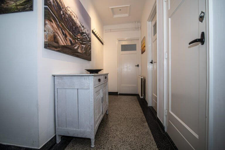 We volgen de hoogwaardige afwerking van het appartement, langs het separate, gemoderniseerde toilet, tot aan de volgende ruimte, de badkamer. Deze is in 2015 gerealiseerd en gemoderniseerd. Hoge ramen over de gehele breedte brengen voldoende licht in deze ruimte. Aanwezig is hier een wastafelmeubel met spiegelkast en de ruime douchecabine met massagedouche, rainshower en handdouche.