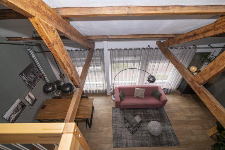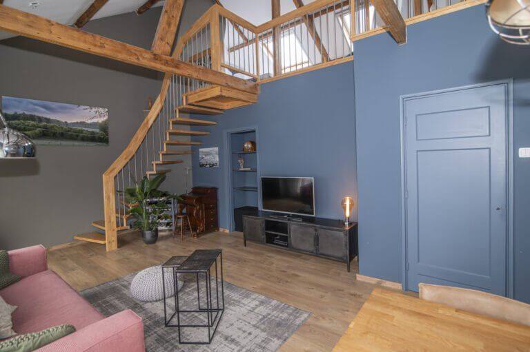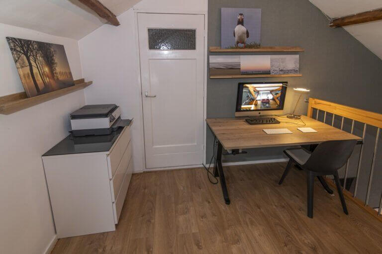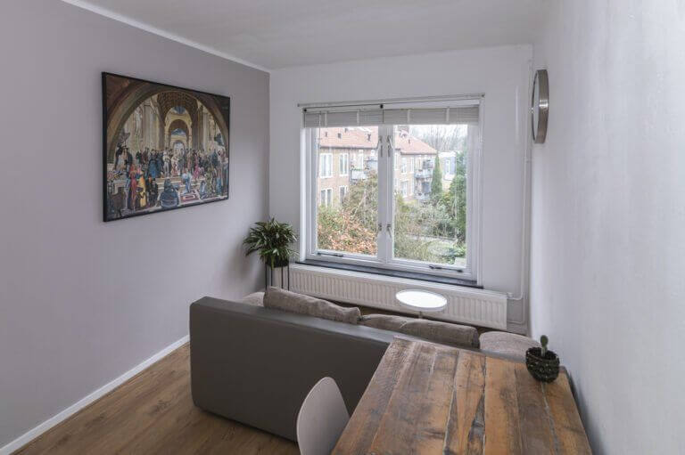We beginnen met de werkelijke “eyecatcher” van deze woning. De woonkamer met vide is het hart van dit appartement. Het is modern en toch uiterst sfeervol met een levendig uitzicht op de Amsterdamseweg. Hier heeft u overigens zeer weinig last van het verkeer door de geluidswerende dubbele ramen. De vide is te gebruiken voor vele doeleinden. De prachtige spanten die we hier zien verbinden boven met beneden waardoor er een prachtige eenheid ontstaat. Door de dakramen, die zijn voorzien van verduistering, is deze vide ook geschikt als slaapruimte en te combineren met werkplek. “Boven” vinden we ook een bergkast met de cv opstelling (Vaillant, bouwjaar 2014), wasmachine aansluiting en uiteraard is het dak goed geïsoleerd. De afwerking is hoogwaardig met o.a. een strak gelegde laminaatvoer, hoge plinten en gestucte wanden.