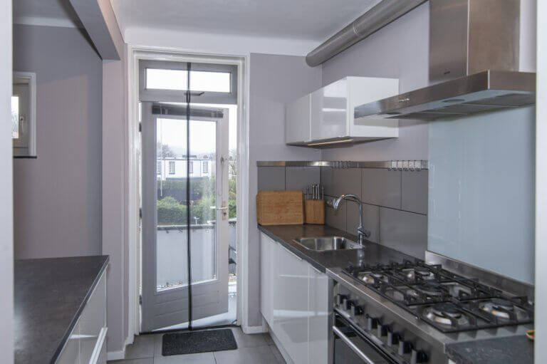 Wanneer we naar de andere zijde van de woning lopen verbindt de gang alle overige ruimtes met elkaar. De keuken, welke is uitgebreid, is een prachtige aanvulling op het woongedeelte van de woning. De keuken is ingericht met de nodige inbouwapparatuur aan één wand van de ruimte. Aan de andere zijde is een werkeiland met schuifladen gerealiseerd waaraan u in de ochtend heerlijk in het zonnetje van uw ontbijt kunt genieten. De zon komt namelijk binnen door de deur naar het balkon. Op het balkon heeft u uitzicht tot aan Sonsbeekpark, heel aangenaam!
