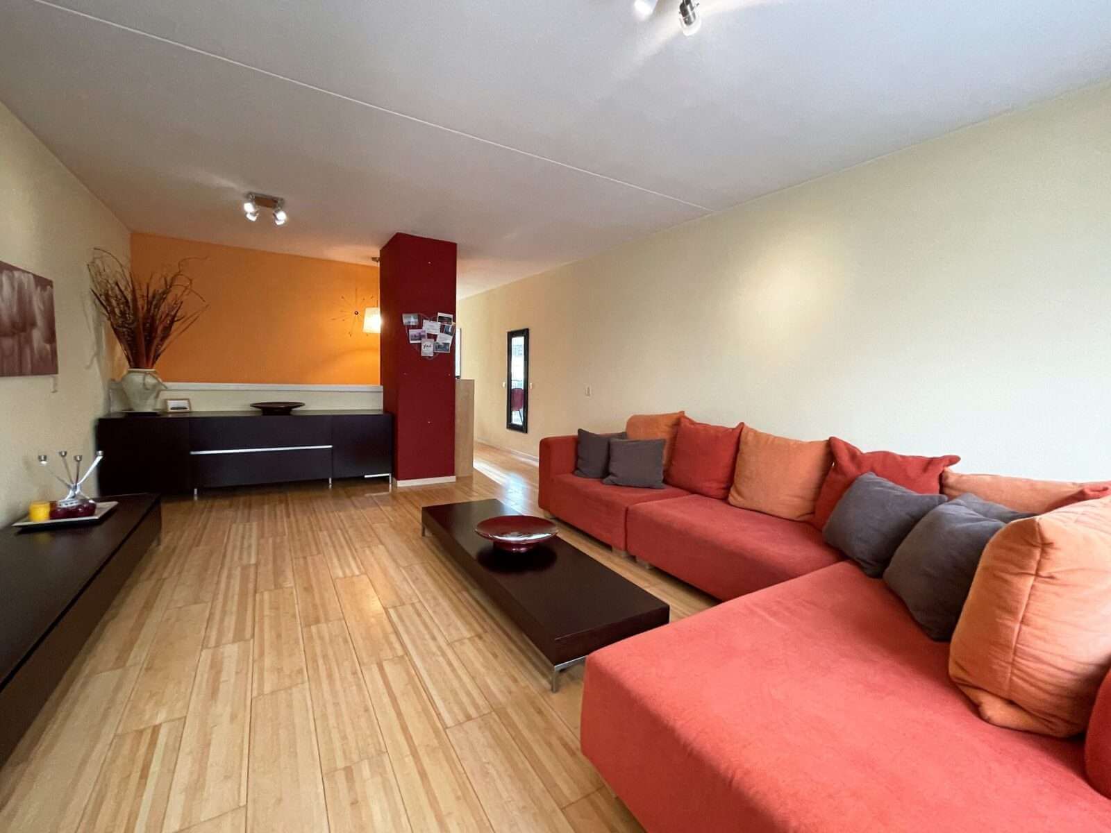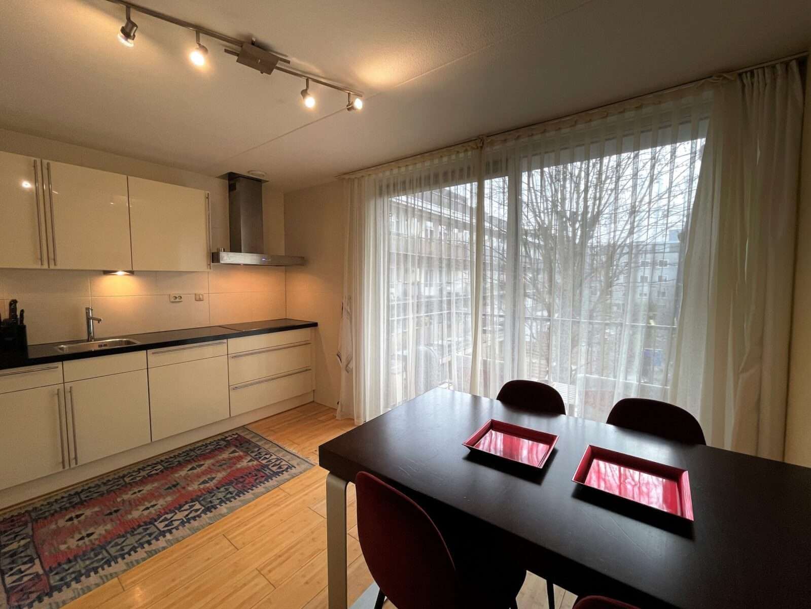 Met de trap bereik je de 2e verdieping en kom je in de zeer ruime huiskamer. De moderne hoek-keuken met eetgedeelte geeft door middel van een grote schuifpui toegang tot het balkon.