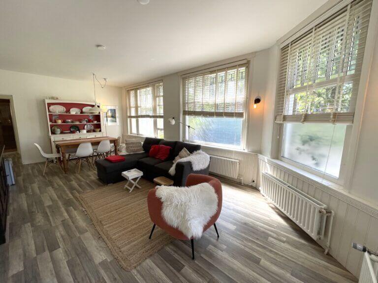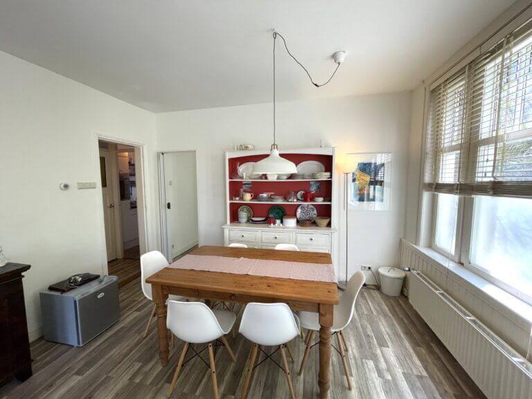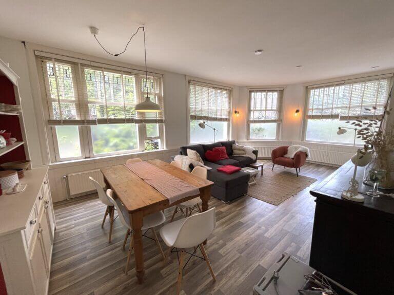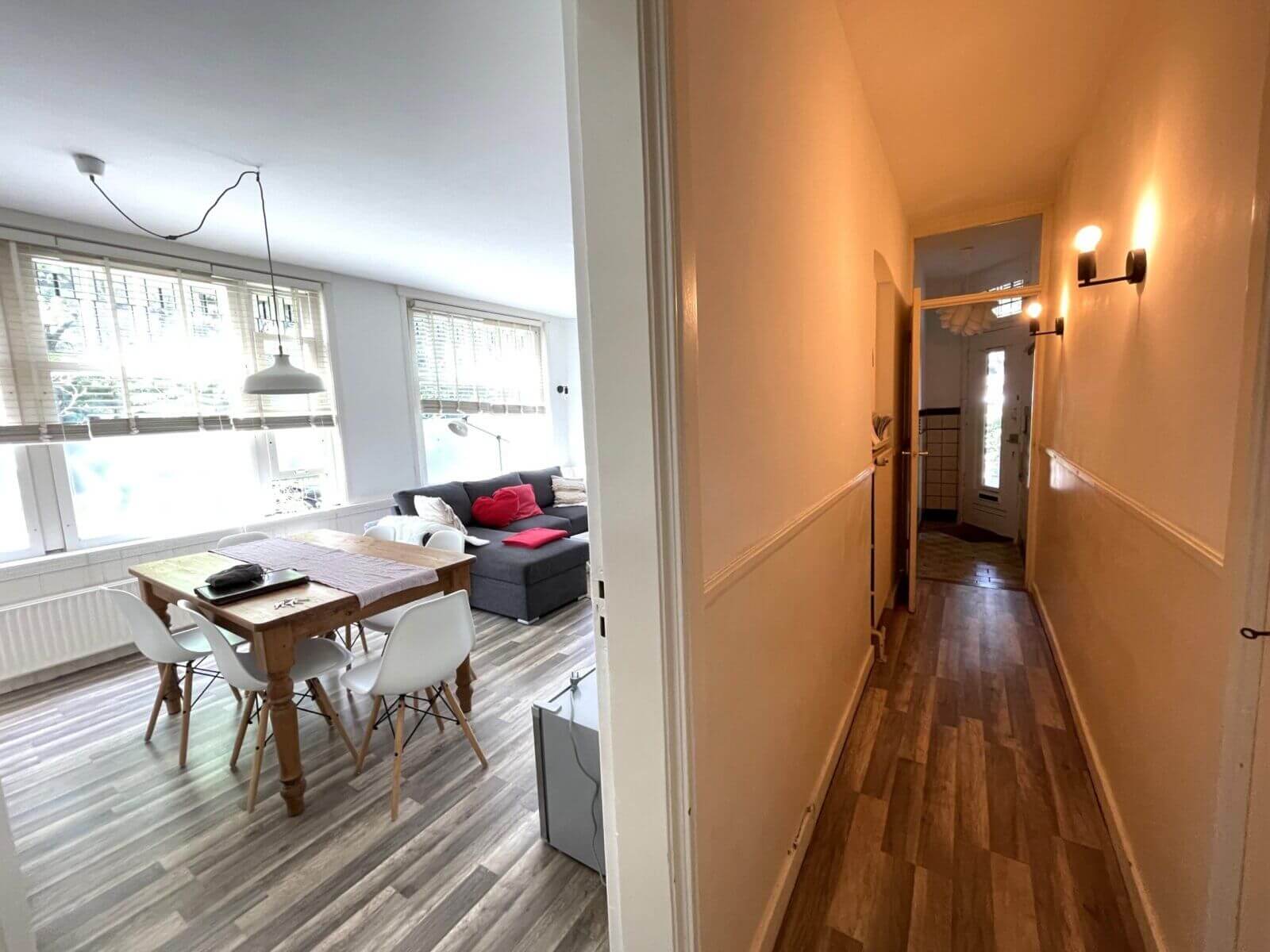 Aan de voorzijde van de woning ligt de verrassend ruime en lichte woonkamer met zitgedeelte en eethoek. Aan de bovenzijde van de ramen zijn nog originele glas-in-lood ramen aanwezig.