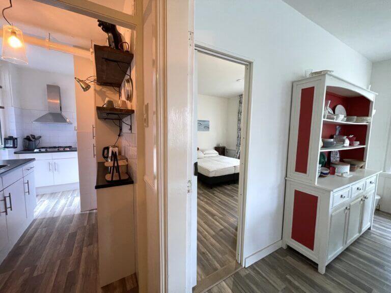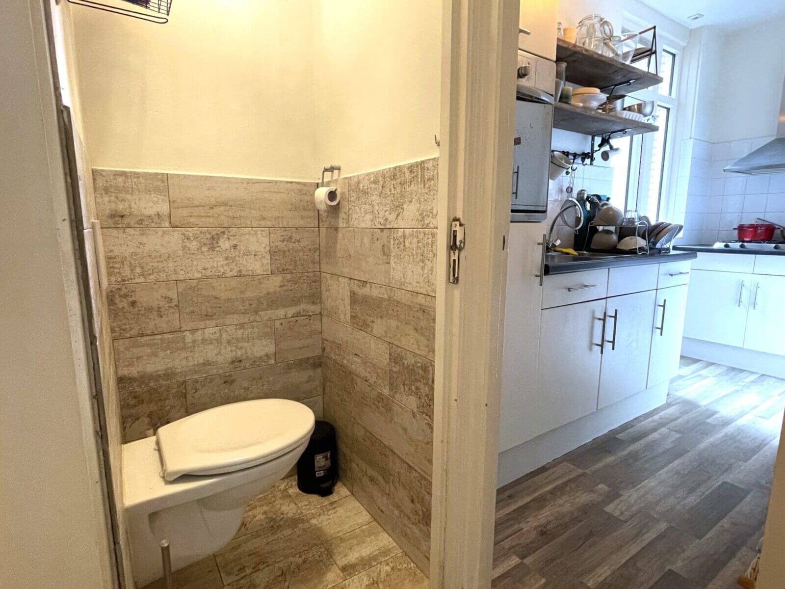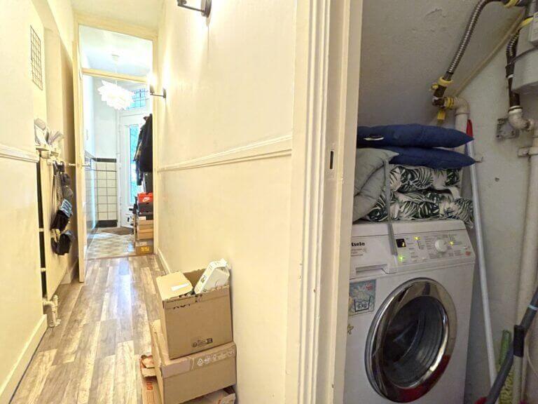 Via de hal bereik je het aparte toilet en de berging met de aansluiting voor de wasmachine. Een open doorloop geeft toegang tot de keuken.