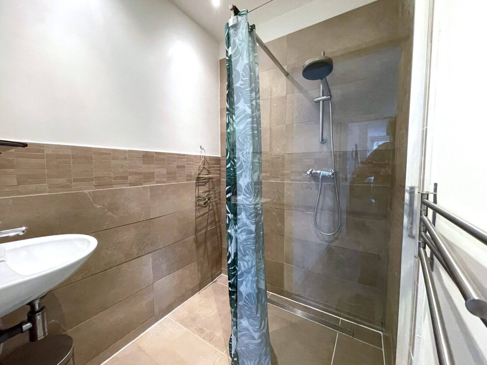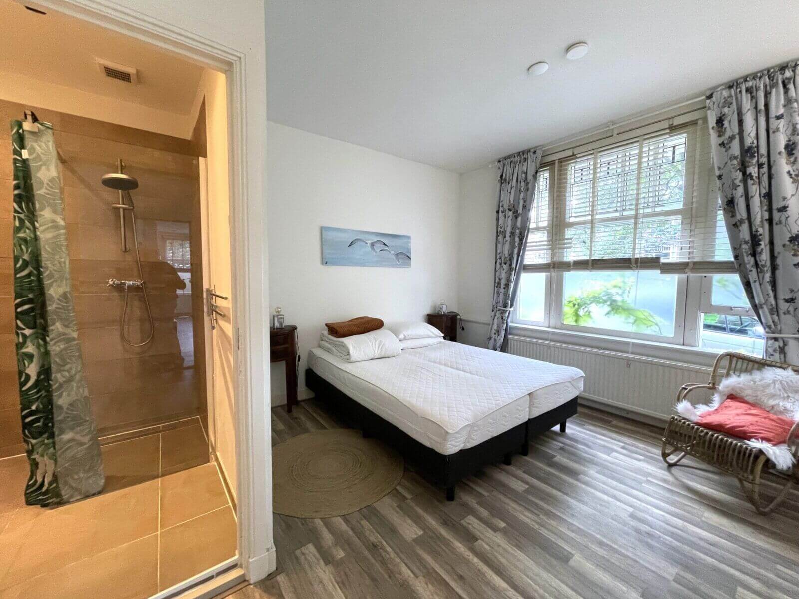 De ruime slaapkamer heeft een badkamer en-suite welke is voorzien van een inloopdouche en vaste wastafel.