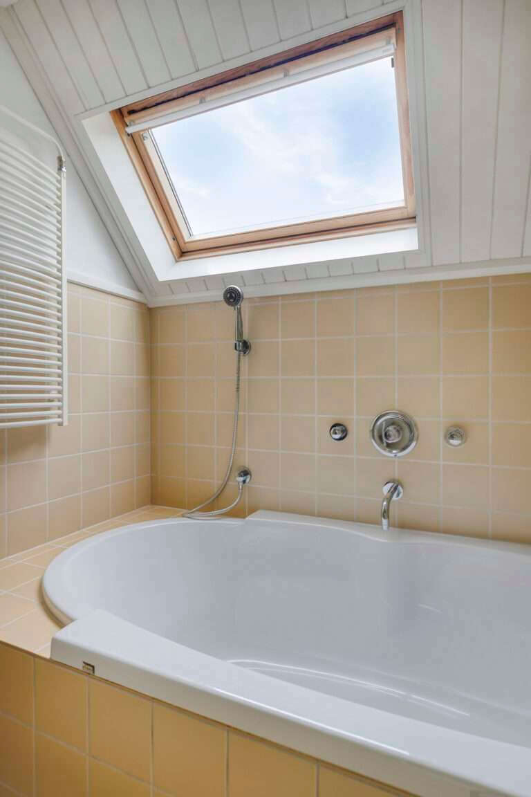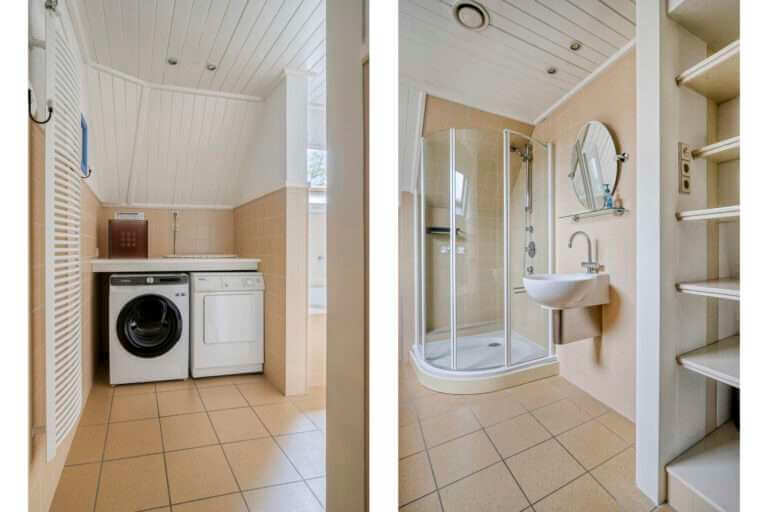 Ruime overloop die toegang geeft tot drie slaapkamers. De badkamer beschikt over een ligbad, aparte douche, wastafel en toilet.