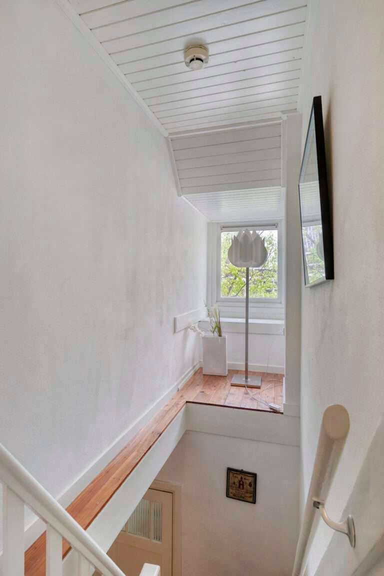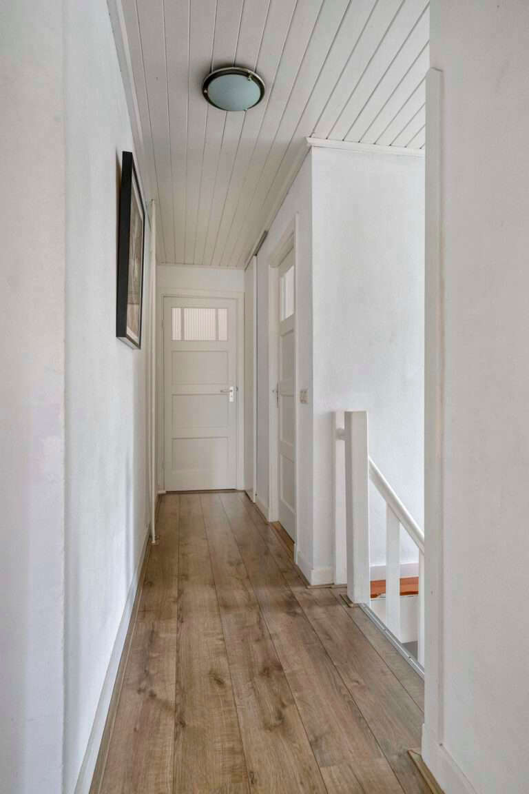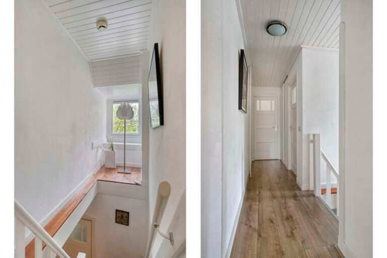 Ruime overloop die toegang geeft tot drie slaapkamers. De badkamer beschikt over een ligbad, aparte douche, wastafel en toilet.