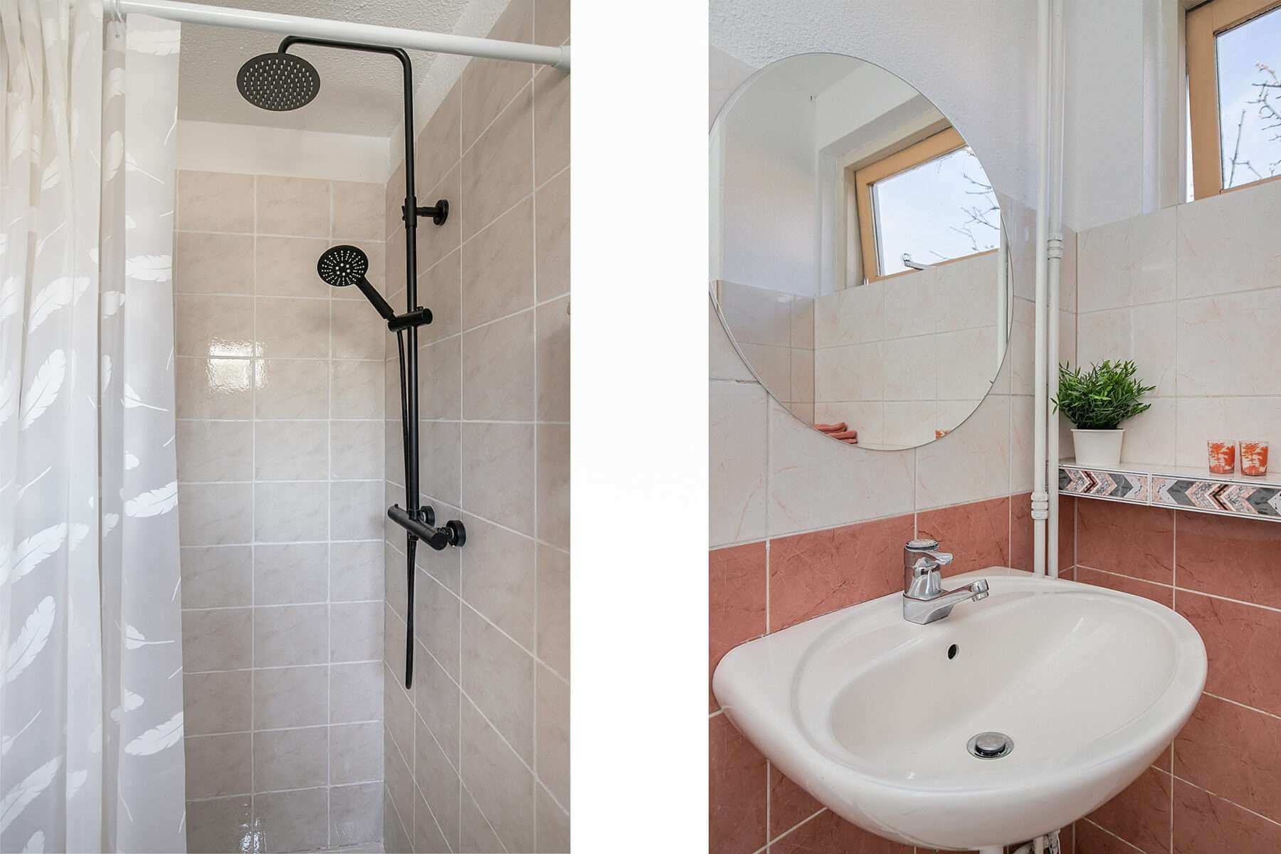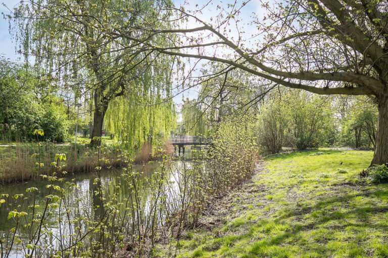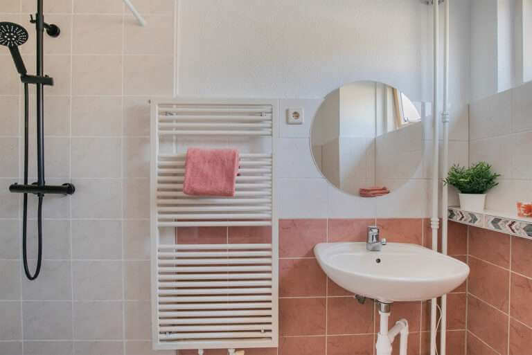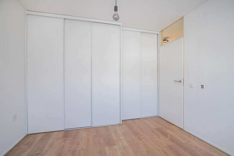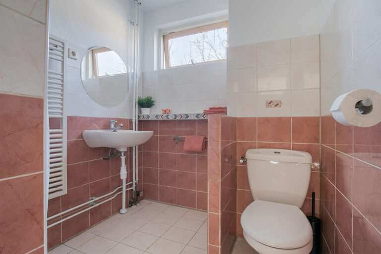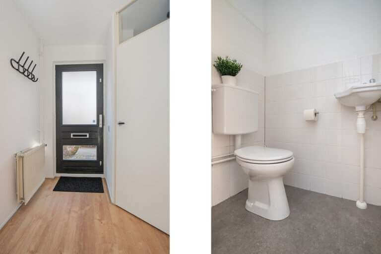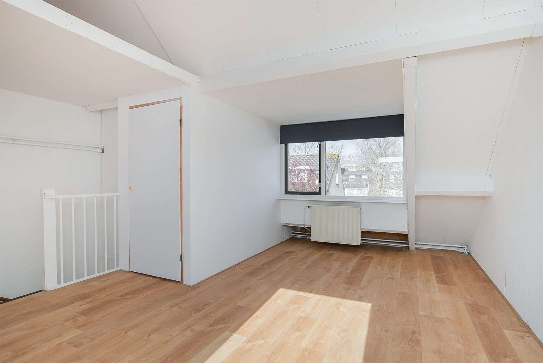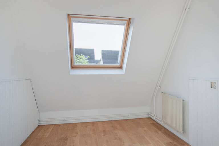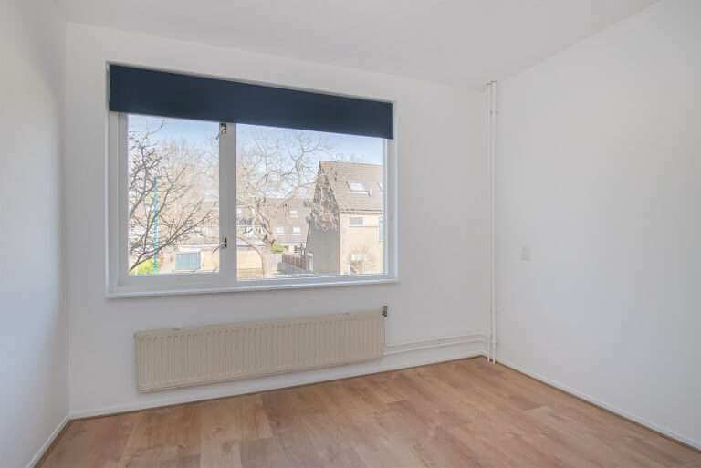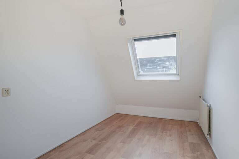 Overloop met toegang tot de drie slaapkamers en de badkamer. Ruime slaapkamer aan de voorzijde (ca. 12 m2) met grote ingebouwde garderobekast. De twee slaapkamers aan de achterzijde zijn beide voorzien van een Velux dakraam (ca. 9 en 7 m2) en de gehele verdieping heeft een mooie nieuwe laminaatvloer. De stijlvol betegelde badkamer is voorzien van douche, toilet, wastafel en handdoekradiator.