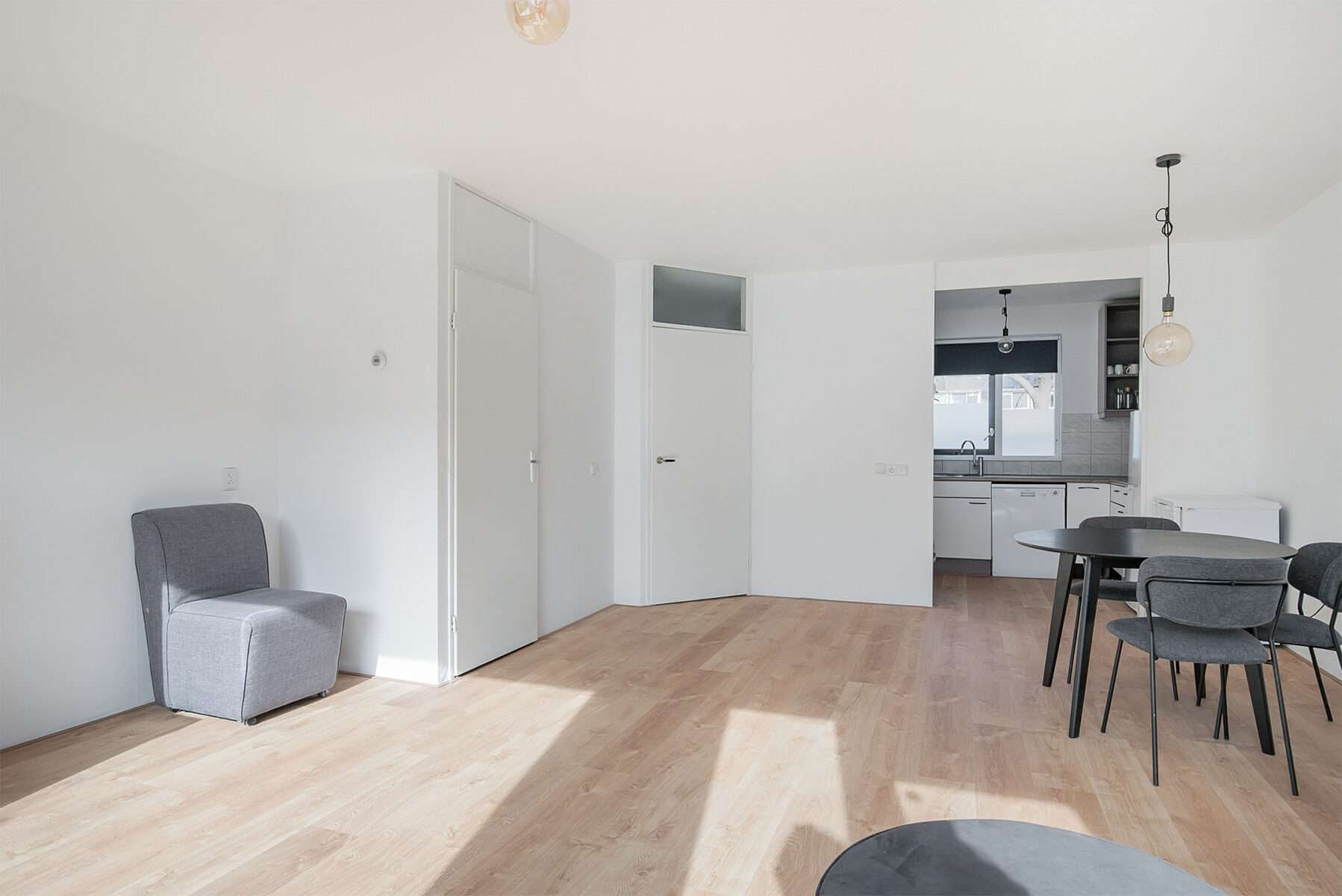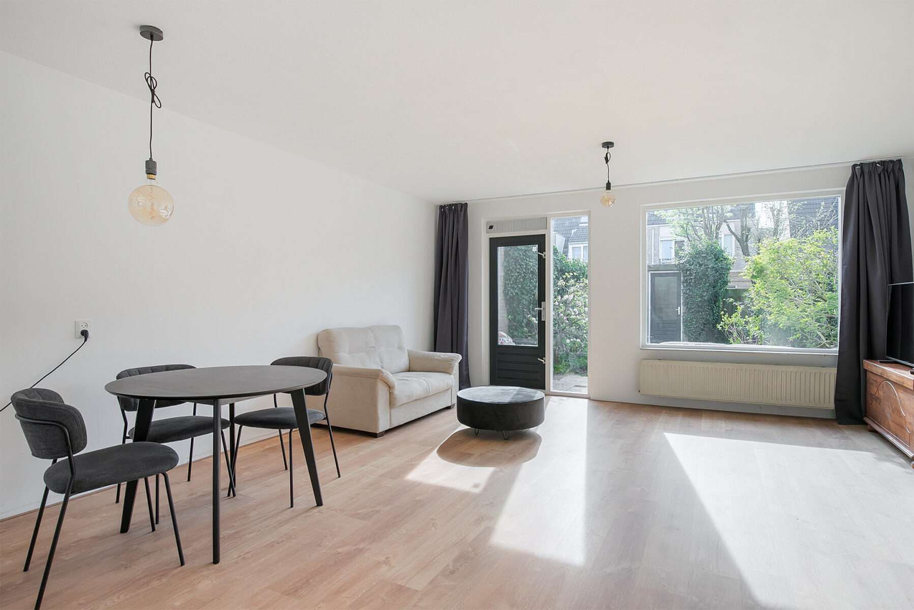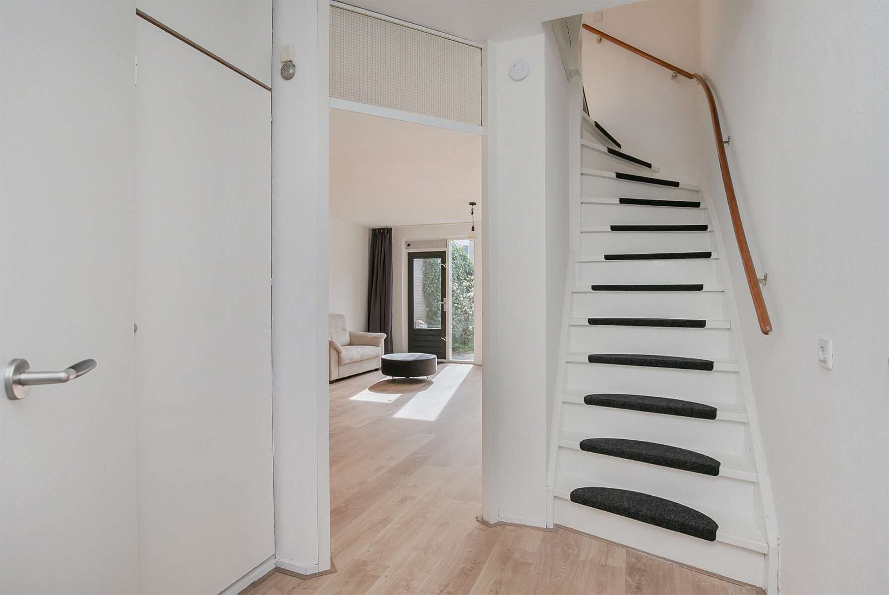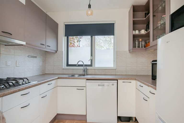 Entree, hal met meterkast, toilet, trapopgang en toegang tot de woonkamer. Woonkamer met trapkast en toegang tot de zonnige achtertuin op het zuidoosten met vrijstaande stenen berging en achterom. Aan de voorzijde ligt de open keuken in U-opstelling v.v. (inbouw)apparatuur: gaskookplaat, oven, magnetron, koel vriescombinatie en afwasmachine. De begane grond is voorzien van een mooie nieuwe laminaatvloer.