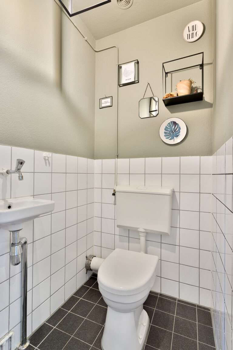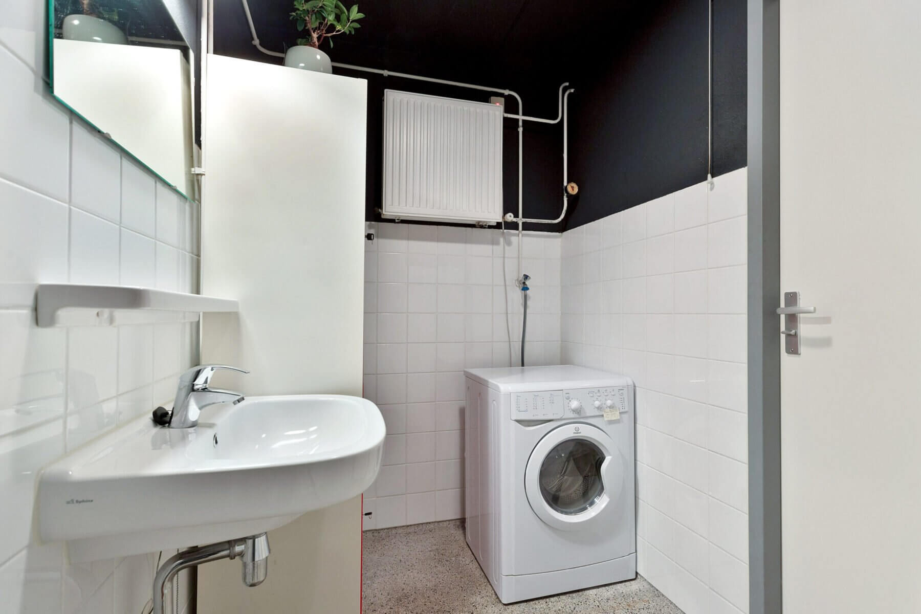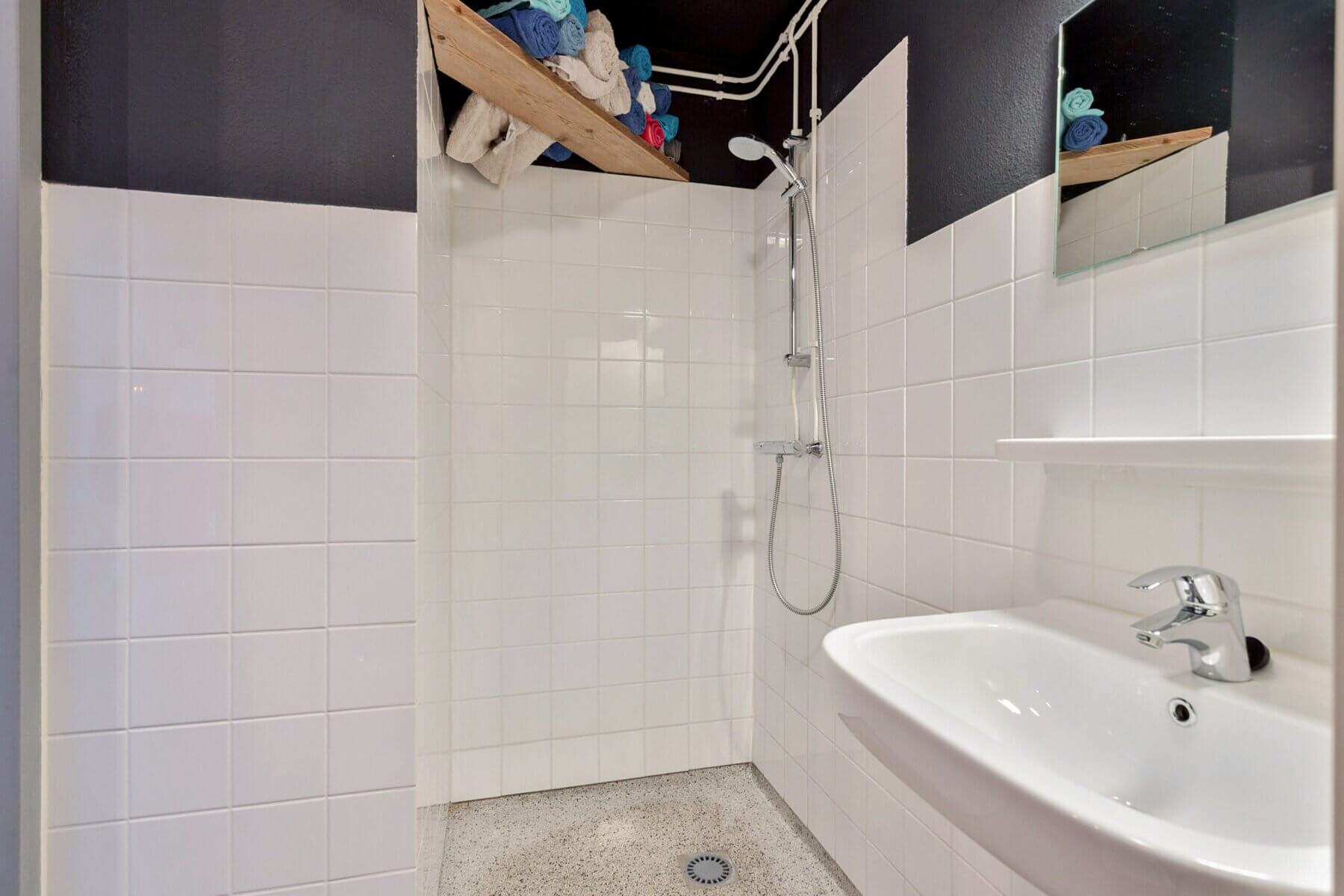 De badkamer is voorzien van een douche, wastafel en een was-droogcombinatie. Er is een apart toilet in de hal.