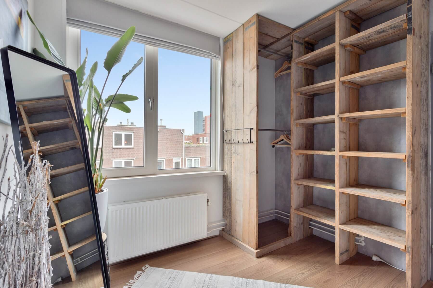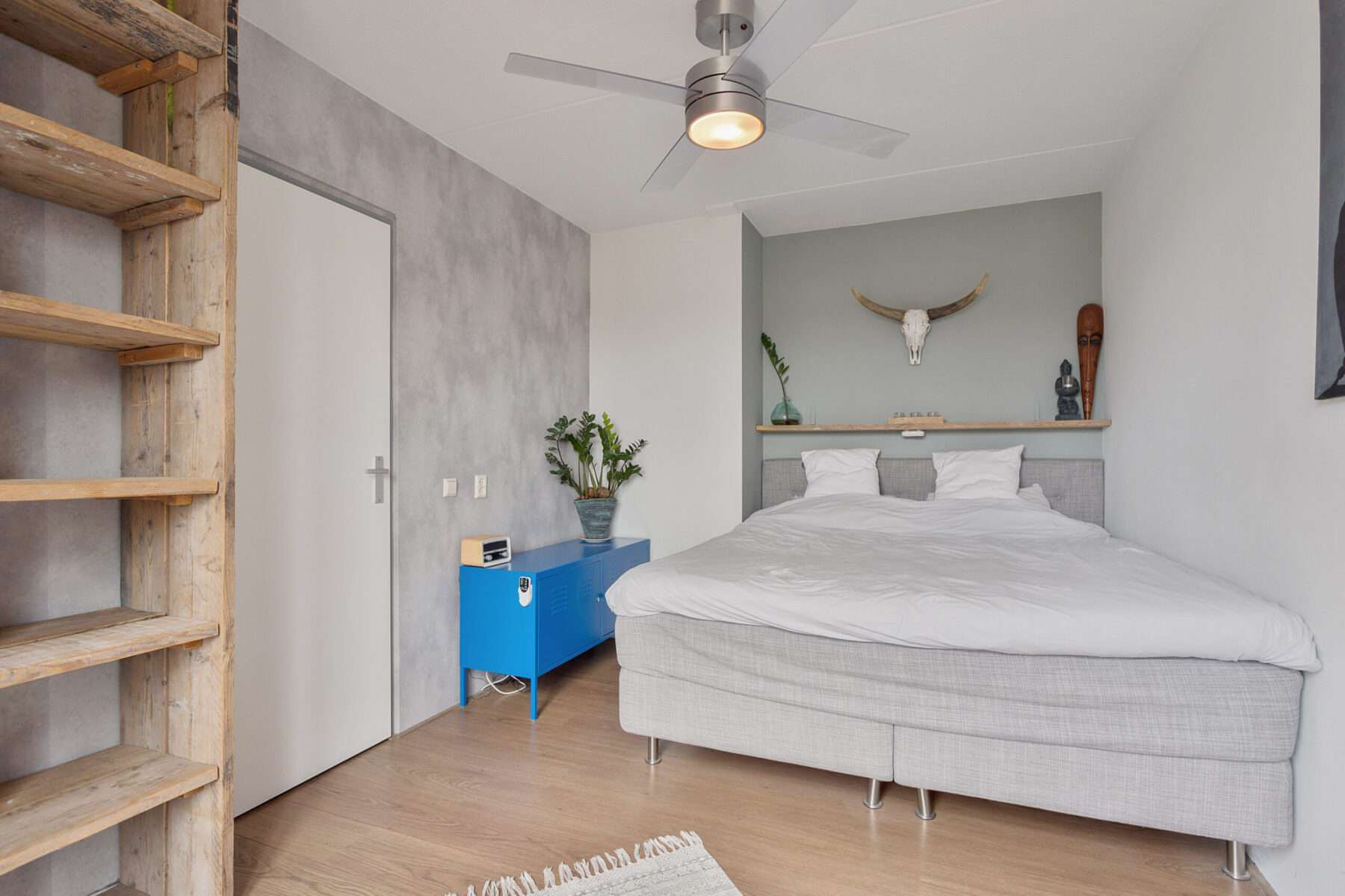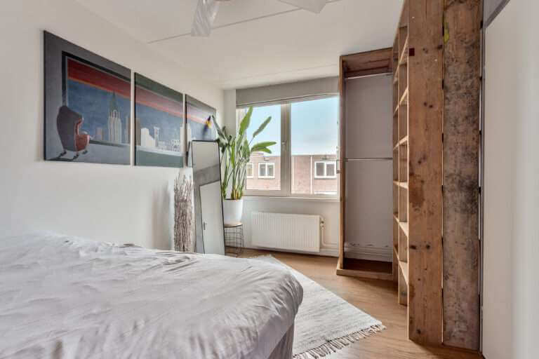 De ruime slaapkamer is voorzien van een heerlijke boxspring en genoeg opbergruimte door de op maat gemaakte steigerhouten (kleding)kasten.