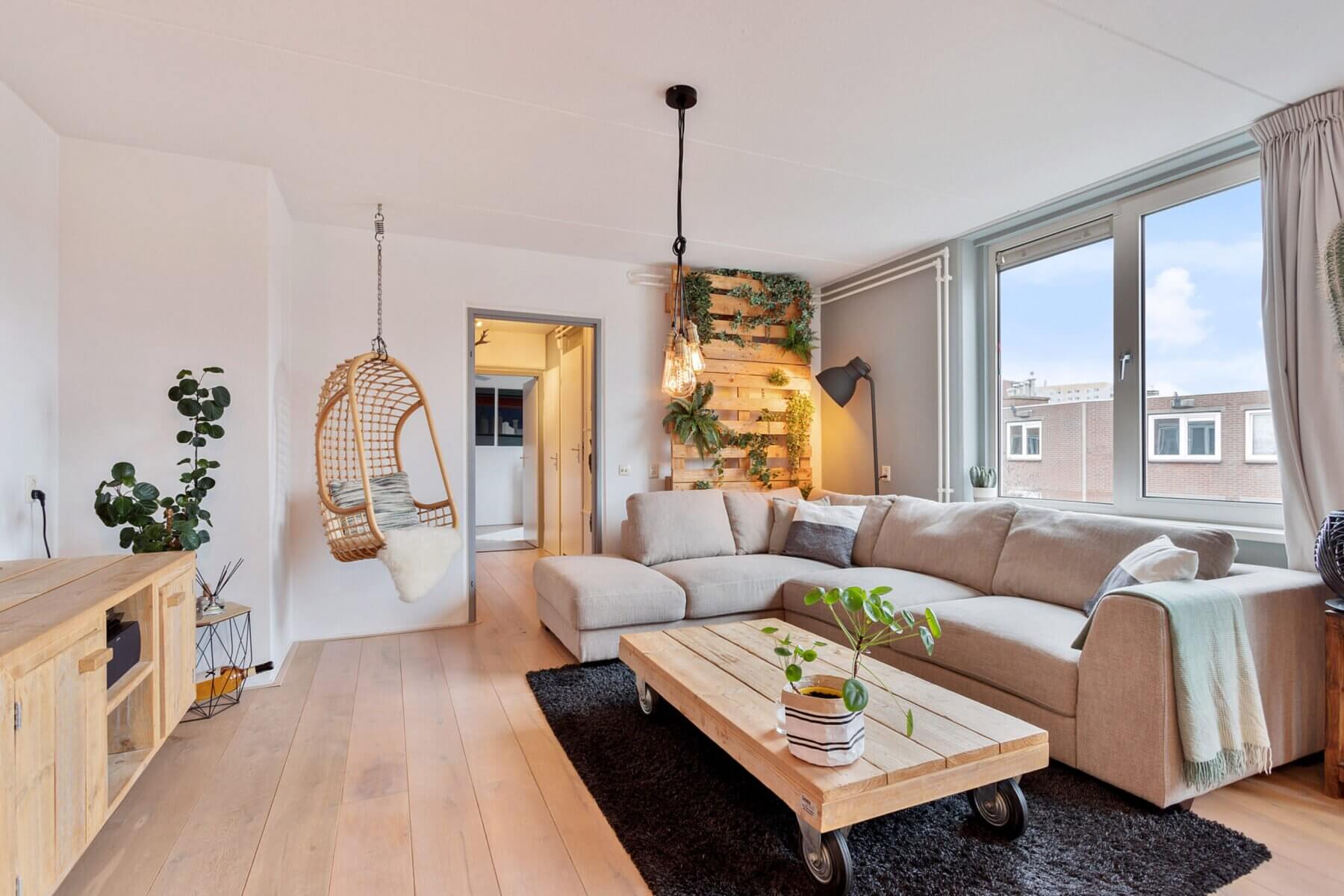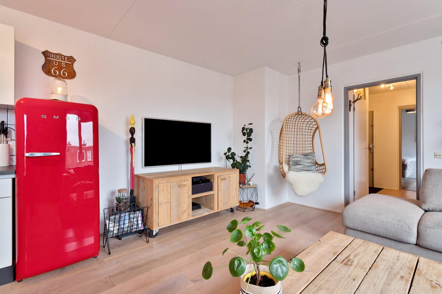 Via de hal bereik je de verrassend ruime woonkamer met veel ramen waardoor de gehele woning heerlijk licht is. De woning is gezellig ingericht met veel op maat gemaakte meubels.