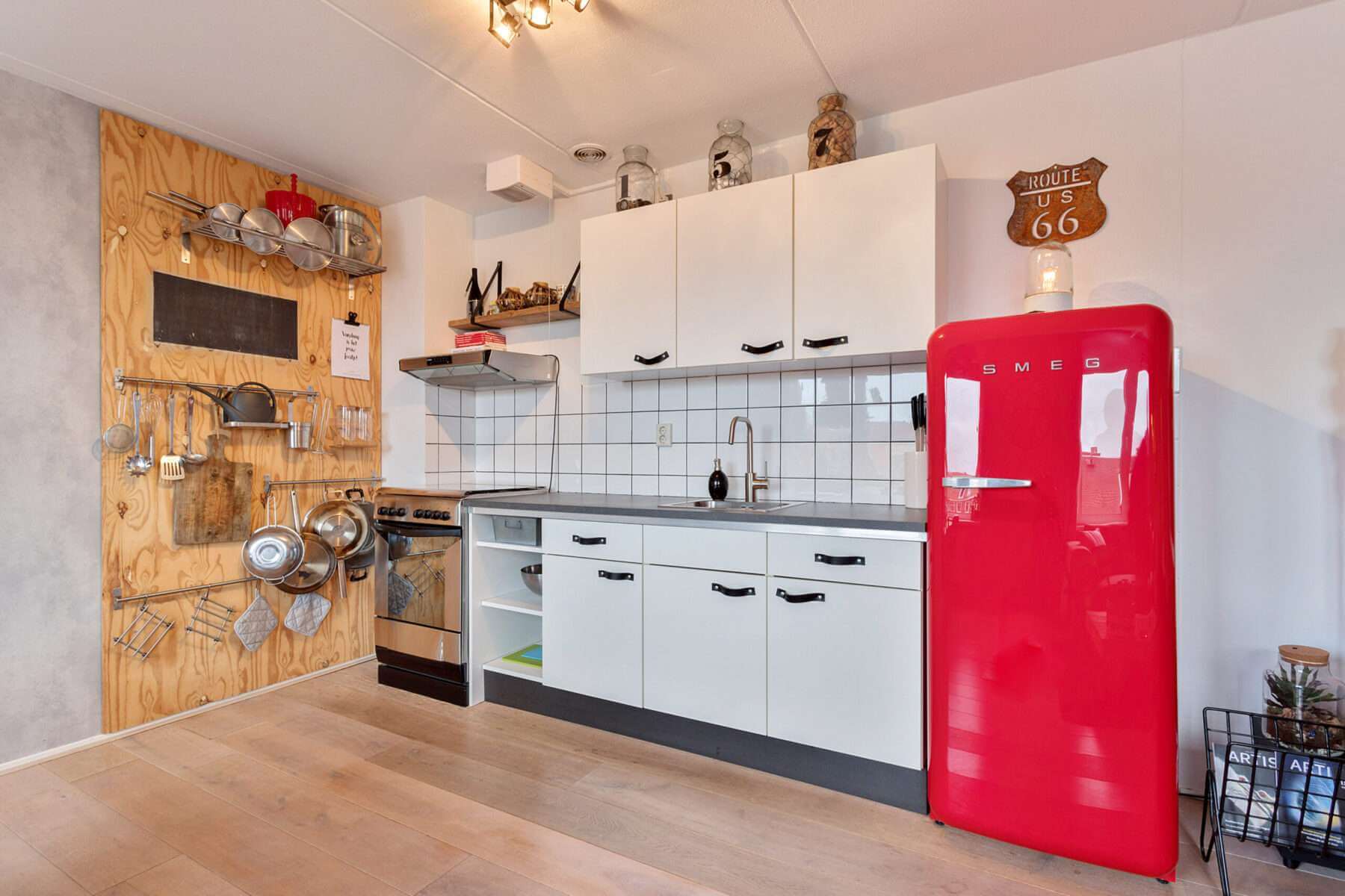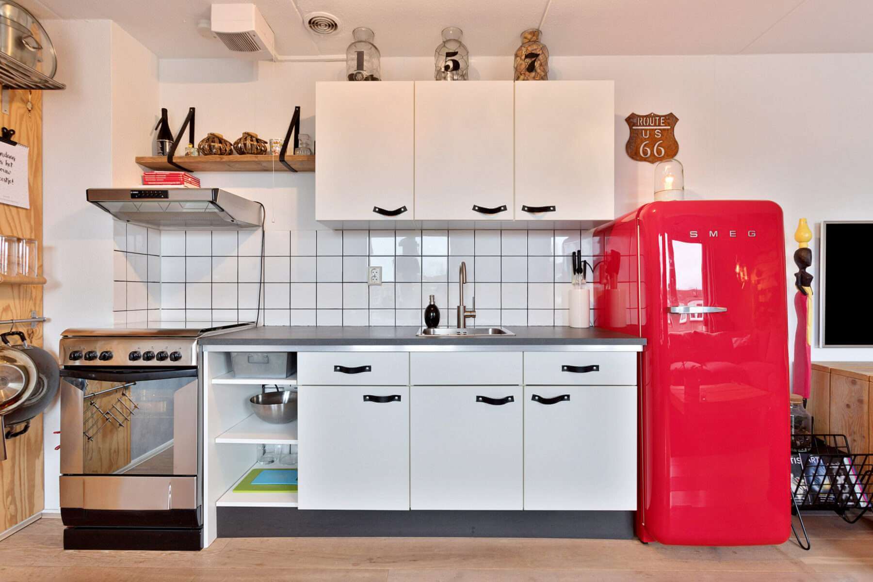 De open keuken met een vaatwasser, 4-pits gasfornuis met afzuigkap, een oven en een ruime Smeg koelkast met vriesgedeelte grenst aan het eetgedeelte.