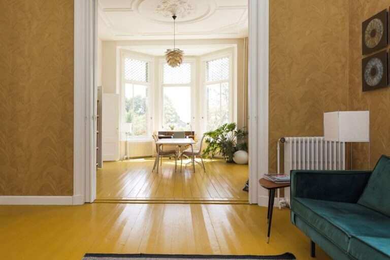 – De woonkamer is voorzien van een houten vloer, originele en suite deuren met glas in lood, hoge plafonds en twee marmeren schouwen