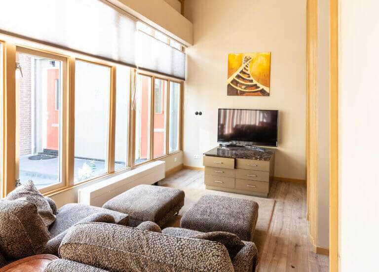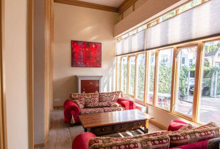 De woonkamer heeft veel raampartijen, waardoor er veel natuurlijk lichtinval is. Dit gecombineerd met de hoge plafonds zorgt voor een enorm ruimtelijk gevoel. De woonkamer is voorzien van een houten vloer, inbouw spots en hanglampen.