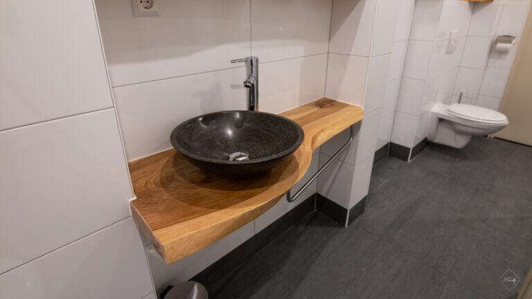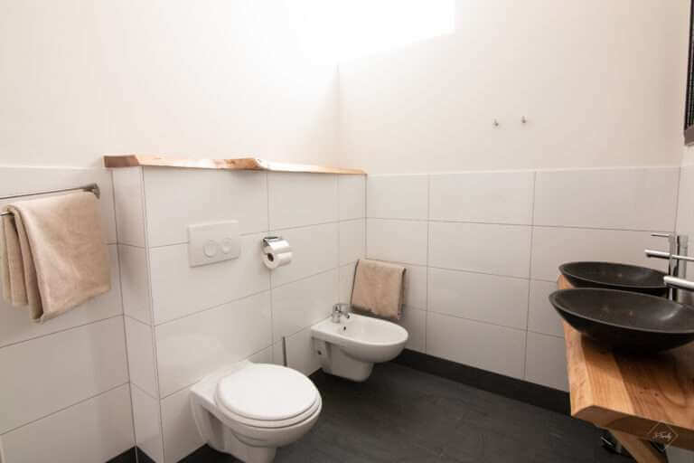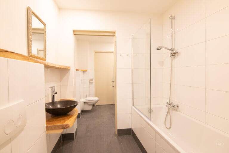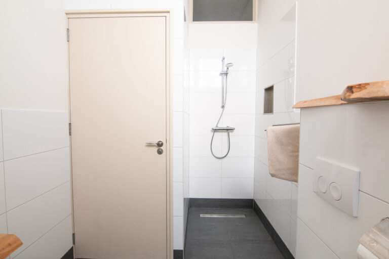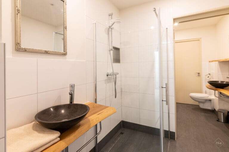De en suite badkamers zijn volledig betegeld en beschikken over hoogwaardige kwaliteit. De badkamers hebben onder andere een inloopdouche, bad, toilet en een (dubbele)wastafel. Doormiddel van de lichte tegels en inbouw spots hebben de badkamers een unieke lichte uitstraling.