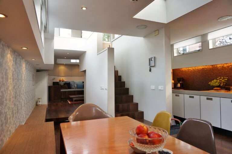 De woning maakt gebruikt van mooie materialen die resulteren in een gezellig, goed functionerend, comfortabel en speels ingericht huis.