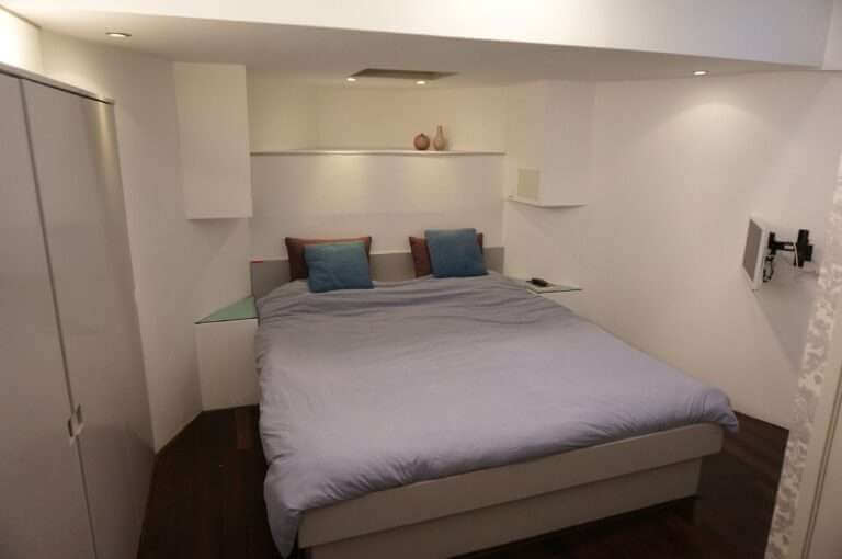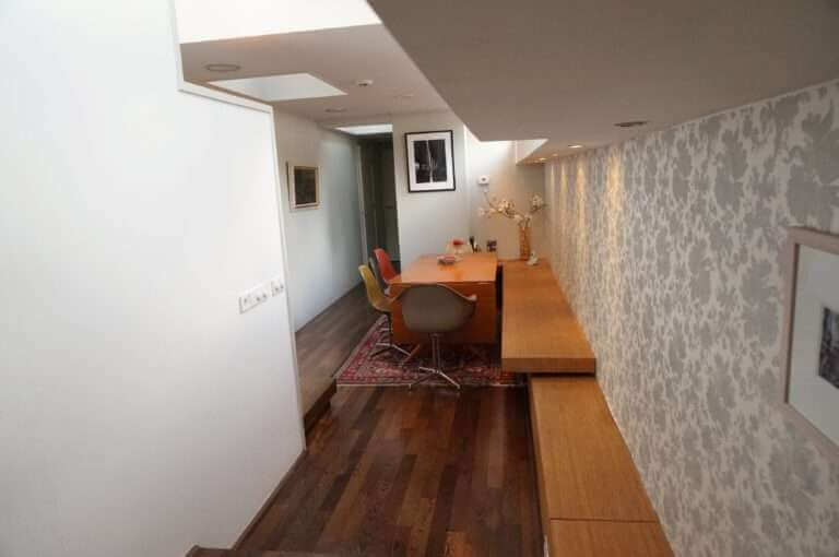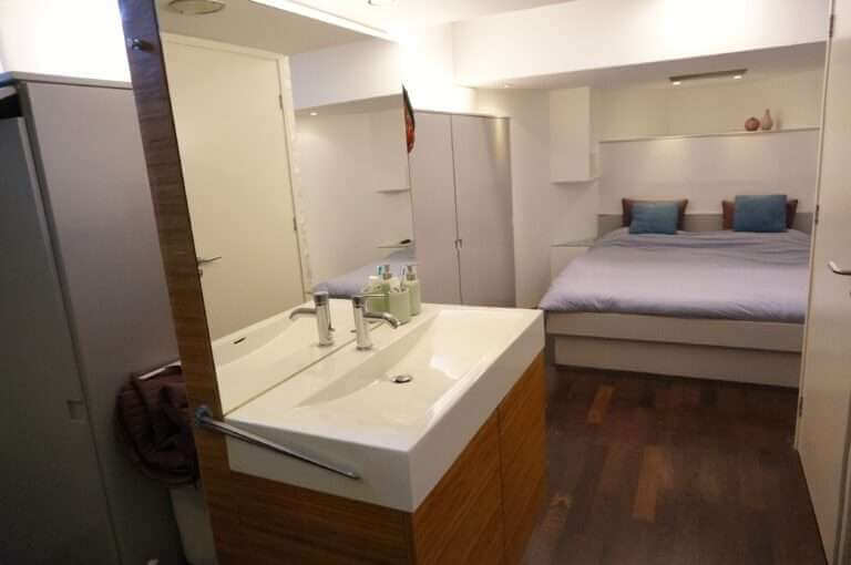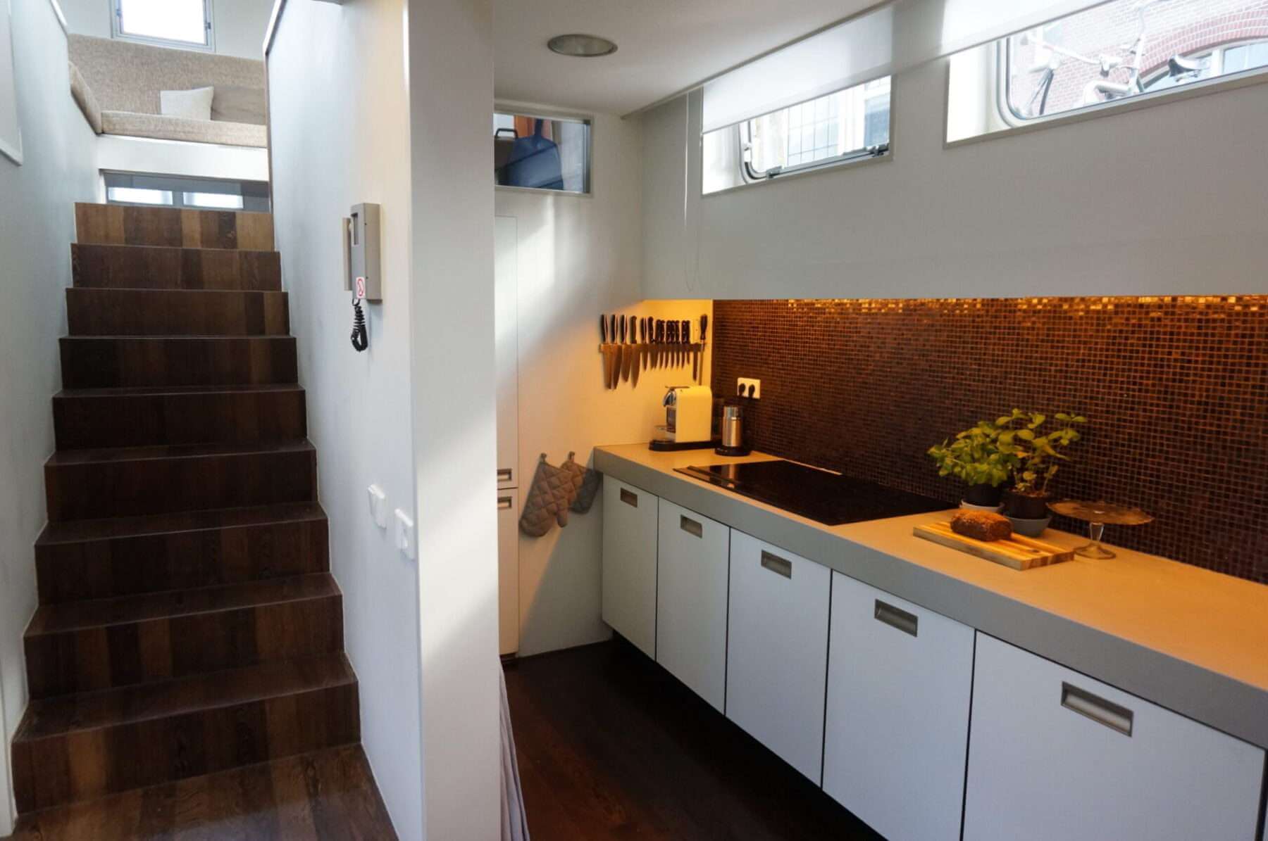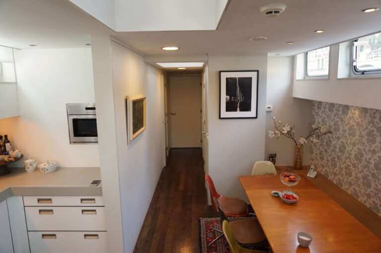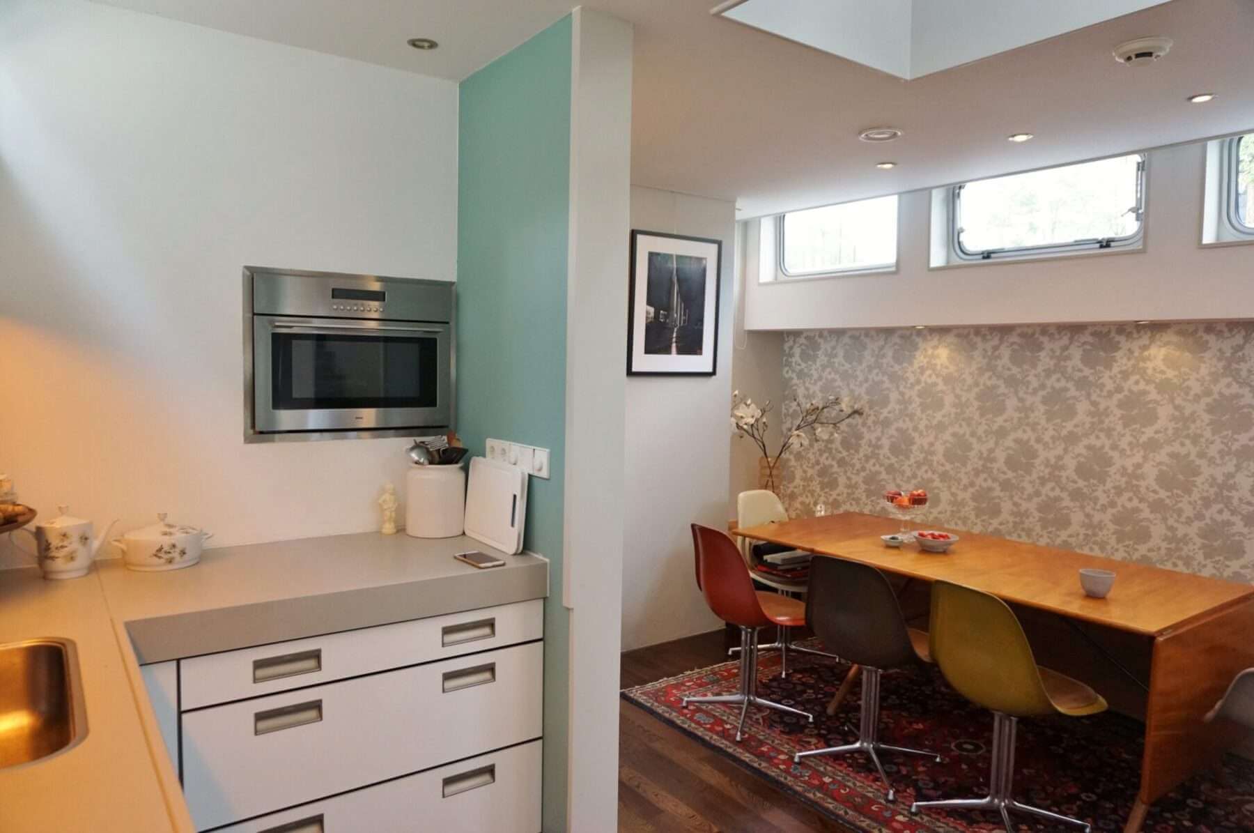 De woonboot (23mx5m) is verrassend ruim met oog voor esthetiek in combinatie met optimalisatie van beschikbare ruimte.