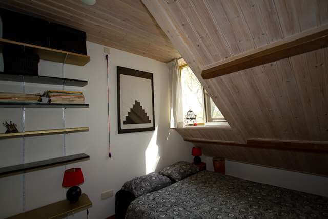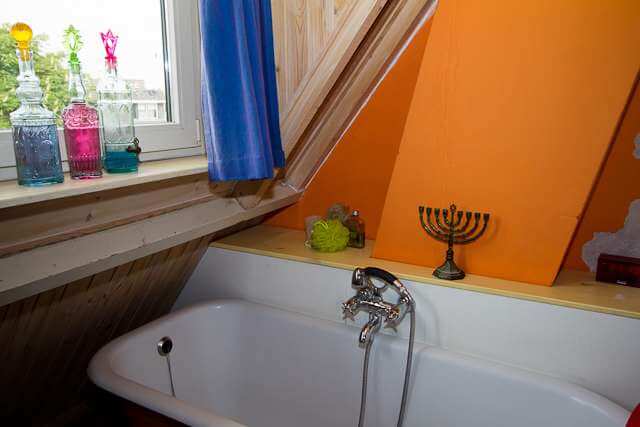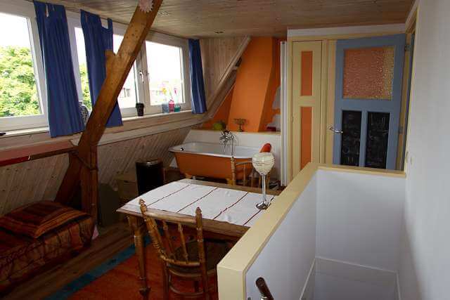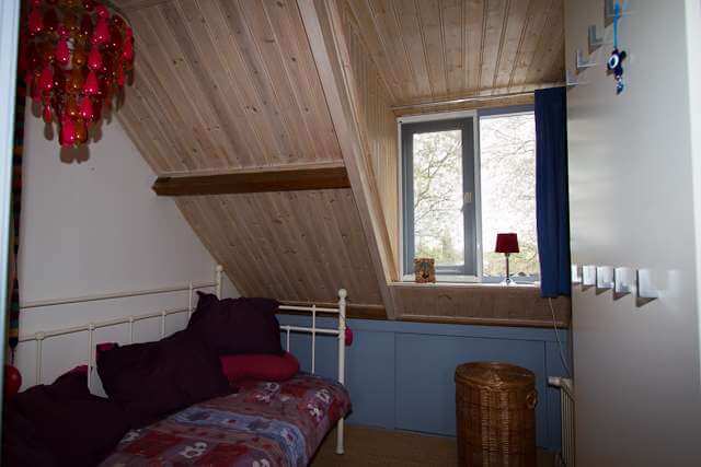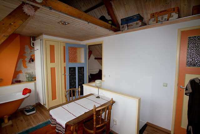 De zolder biedt naast een algemene open ruimte met bad tevens toegang tot 2 slaapkamers, een wasruimte en een vliering.