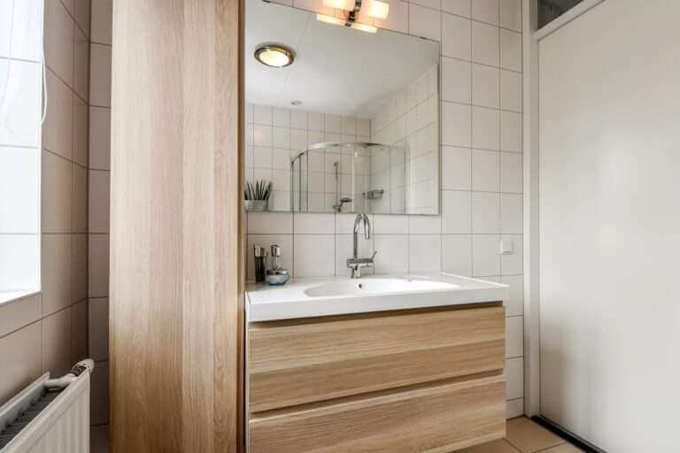 Trap naar de eerste verdieping, hier zijn 2 ruime slaapkamers gelegen. Badkamer met douchecabine, tweede toilet en wastafelmeubel.