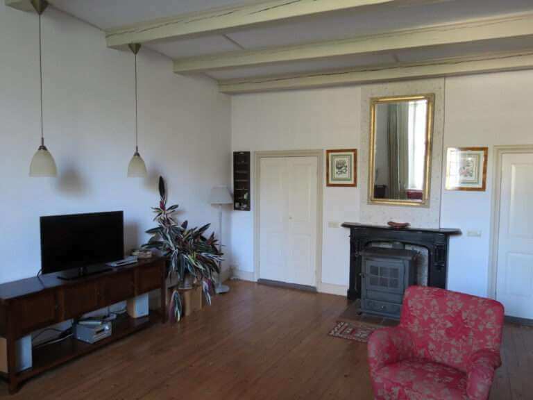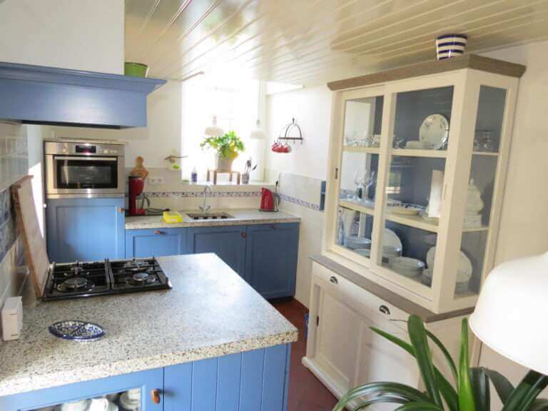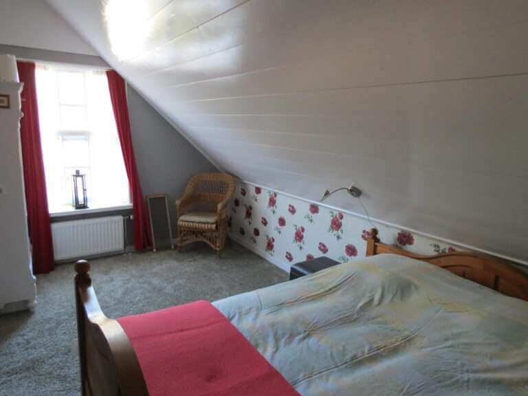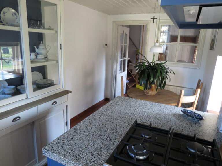 Hal met trap naar boven en toegang tot de afgesloten keuken, het toilet en de woonkamer. De keuken in boerenstijl is voorzien van een kookeiland met 4-pits gasfornuis met wokbrander en afzuigschouw, koelkast, combimagnetron en vaatwasser. Via de grote authentieke woonkamer met hoog plafond en sierkachel toegang tot een kantoortje, gemaakt in de voormalige bedstede en toegang tot een gang met antieke tegelvloer. Via deze gang toegang tot de iets verhoogd liggende 1e slaapkamer, de badkamer voorzien van ligbad, douchecabine, wastafelmeubel en 2e toilet, en de kelder met hierin de wasmachine en droger.