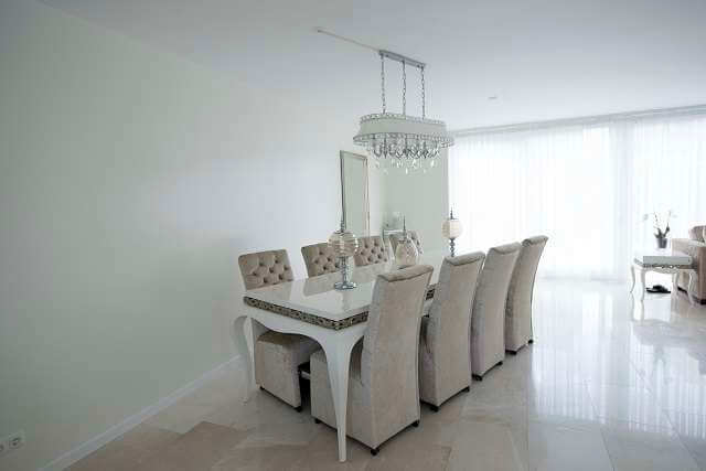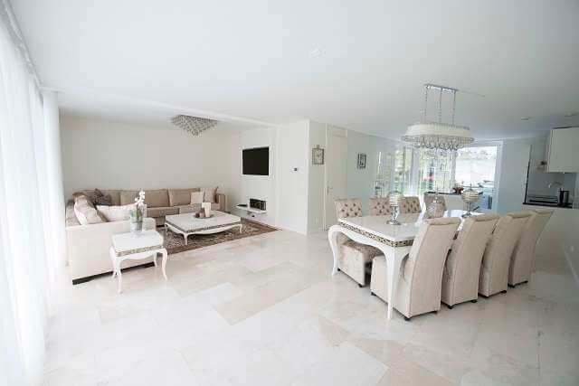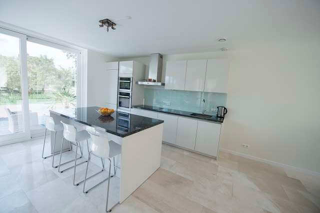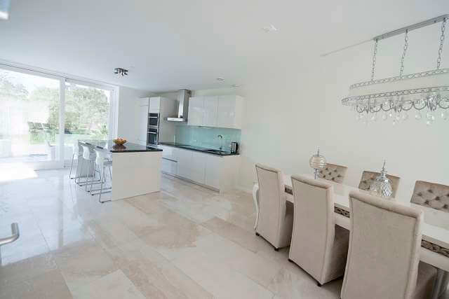 Entree; gang, toiletruimte, aansluitend de trapopgang. De ruime tuingerichte woonkamer heeft een mooi uitzicht over de brede groenstrook en het water. Witte marmeren vloer met vloerverwarming. Zeer luxe open keuken, voorzien van alle denkbare gemakken.