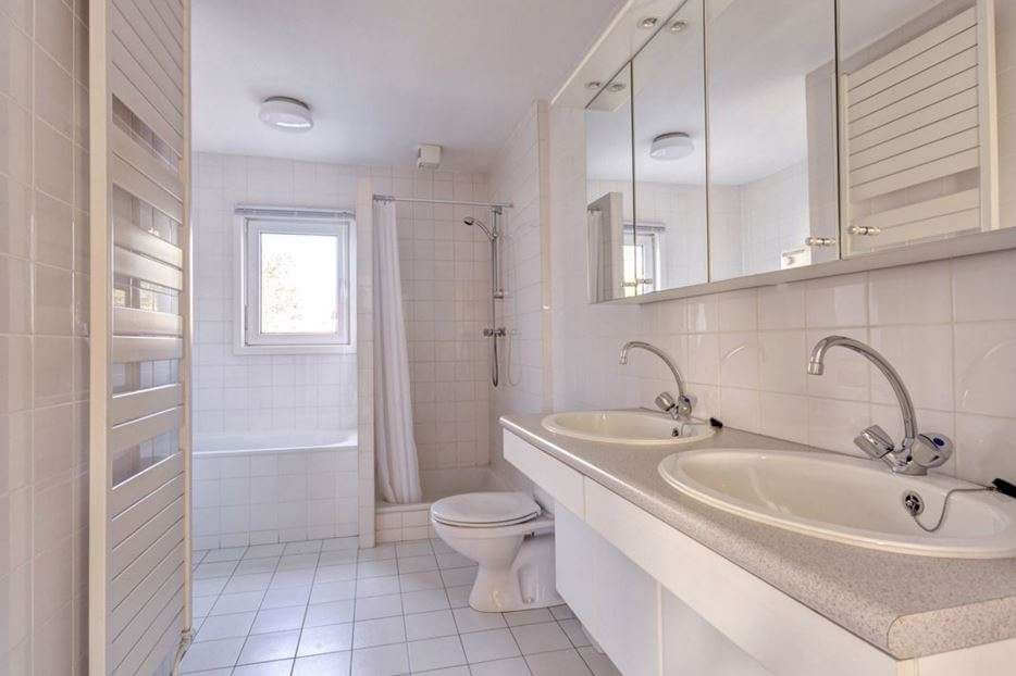 Overloop, badkamer bestaande uit ligbad, separate douche, toilet, wastafelmeubel met dubbele wastafel, design-radiator.