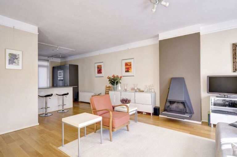 Derde verdieping: hal, toilet, zeer ruime L-vormige woonkamer met open haard, luxe open keuken voorzien van ijskast, vriezer, vaatwasser, magnetron en oven.