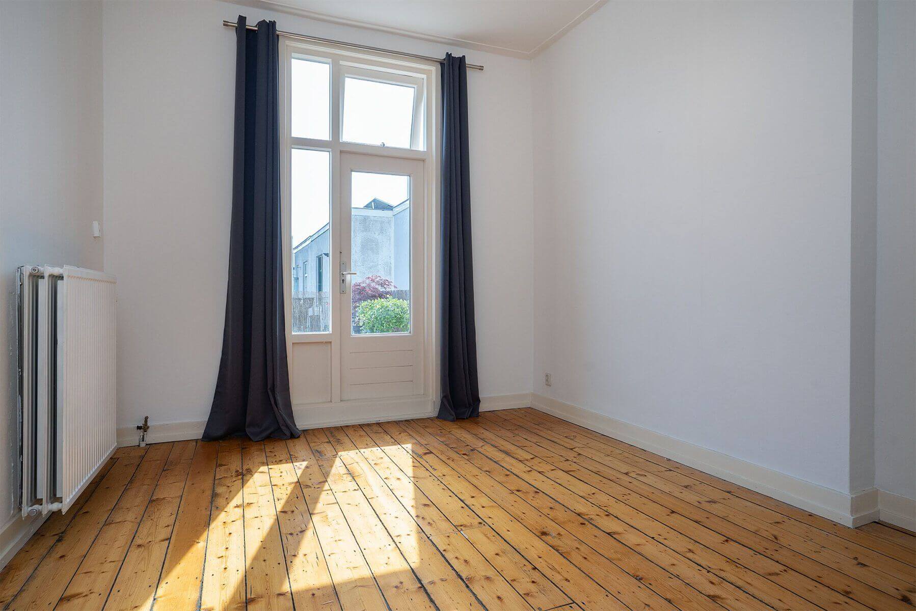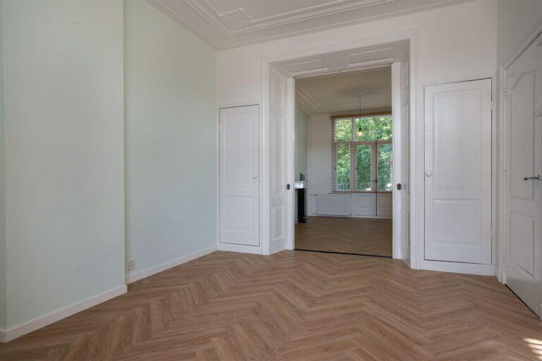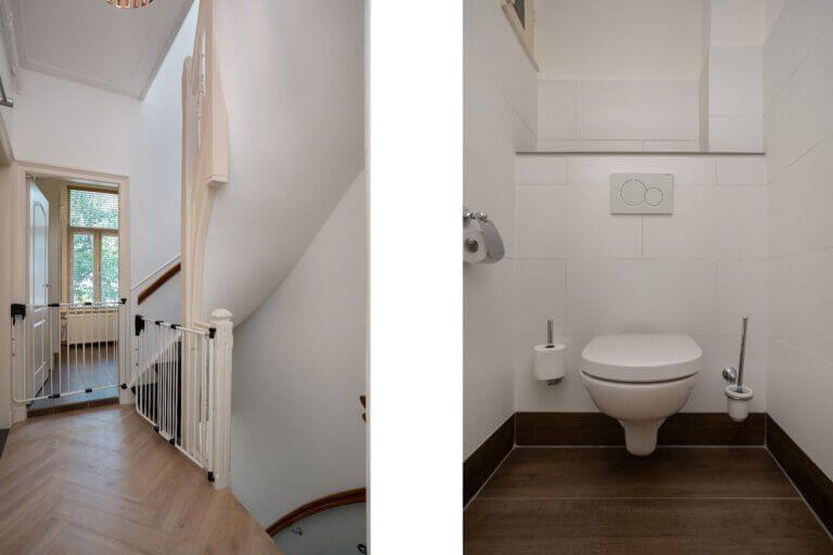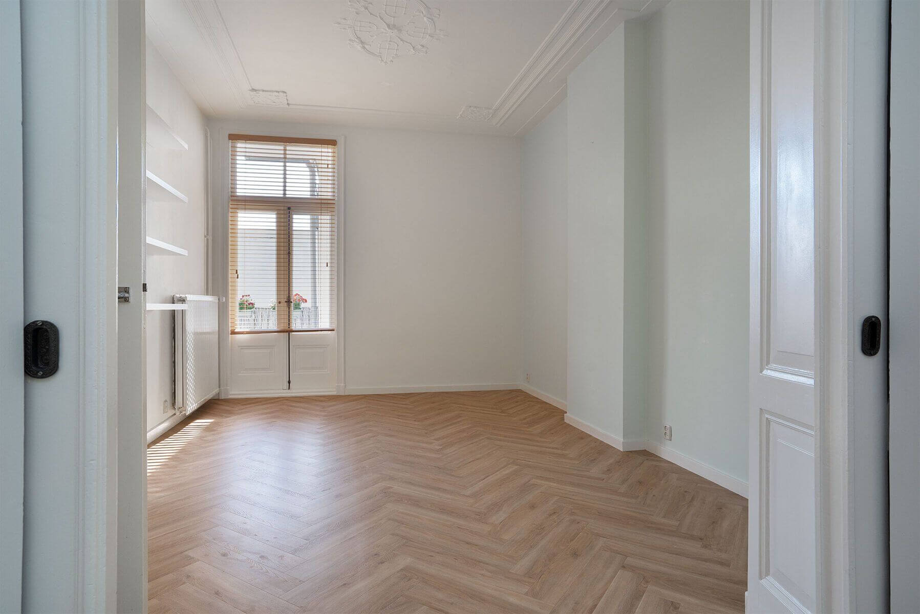 Overloop, toiletruimte met fonteintje, sfeervolle en tevens lichte woonkamer en suite (van maar liefst 30 m2) met originele en suite deuren, pvc visgraatvloer, authentieke schouw, openslaande deuren naar het balkon aan de voorzijde en openslaande deuren naar het 1e dakterras aan de achterzijde.